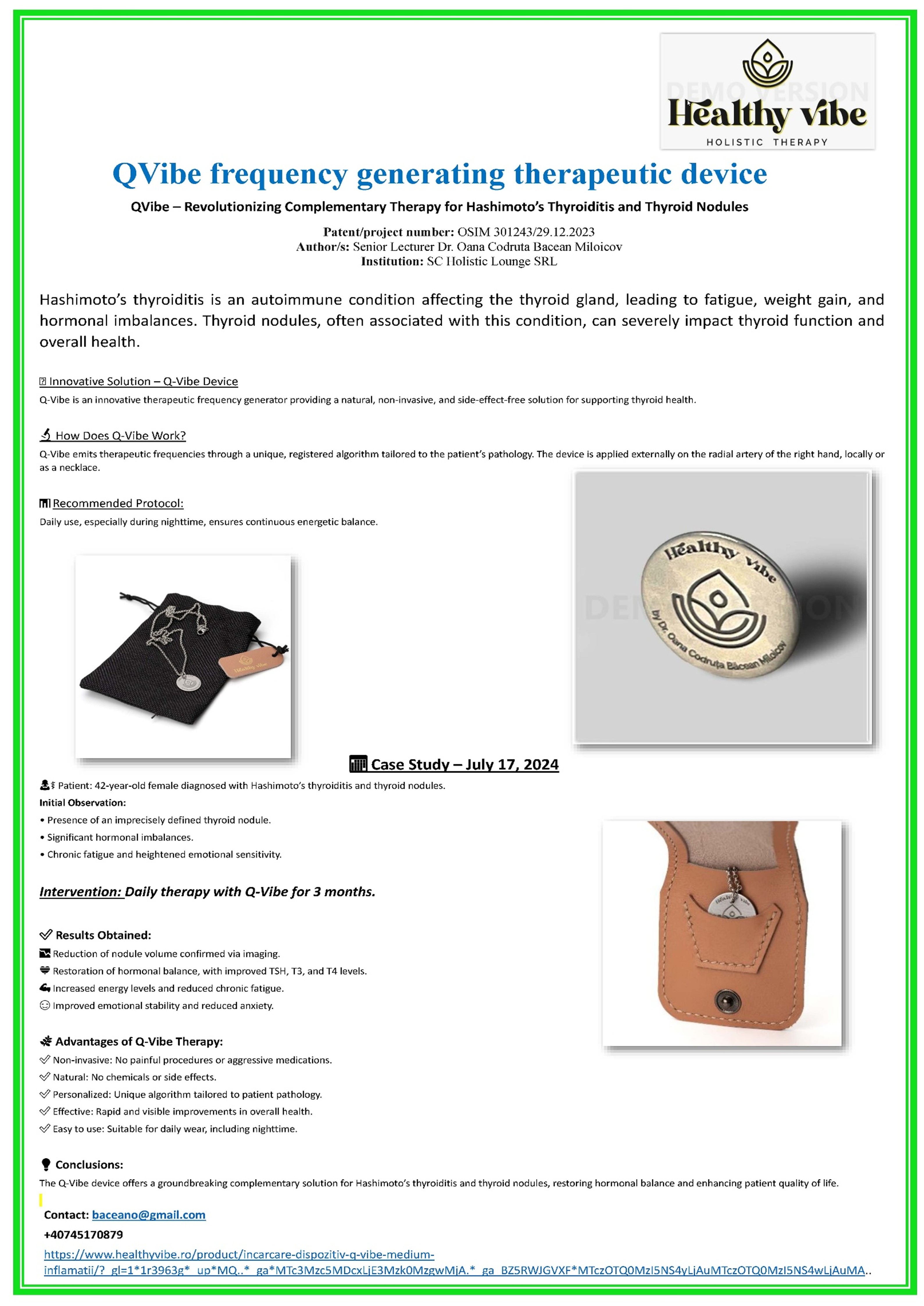Hashimoto’s thyroiditis is an autoimmune condition affecting the thyroid gland, leading to fatigue, weight gain, and hormonal imbalances. Thyroid nodules, often associated with this condition, can severely impact thyroid function and overall health. Q-Vibe is an innovative therapeutic frequency generator providing a natural, non-invasive, and side-effect-free solution for supporting thyroid health