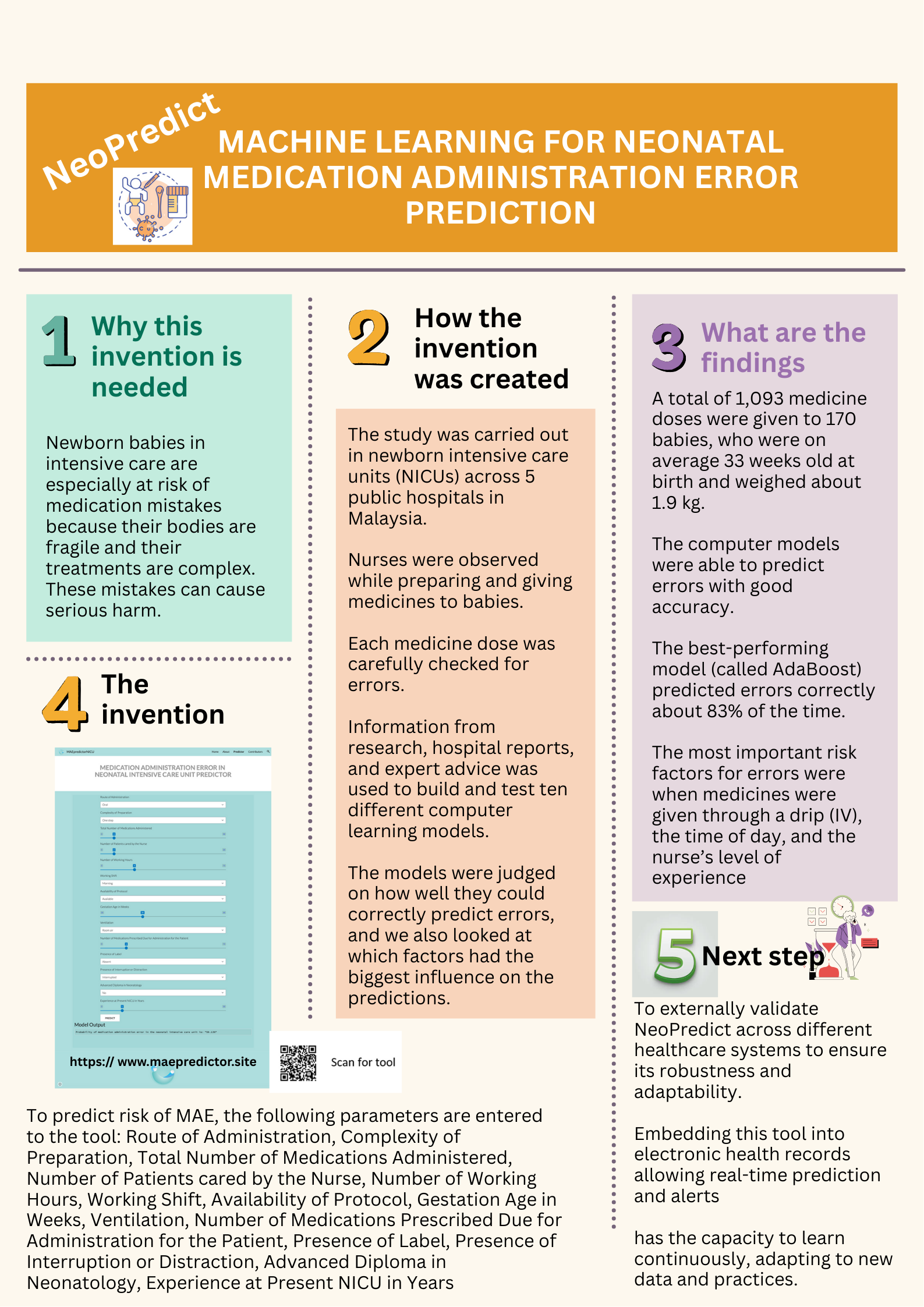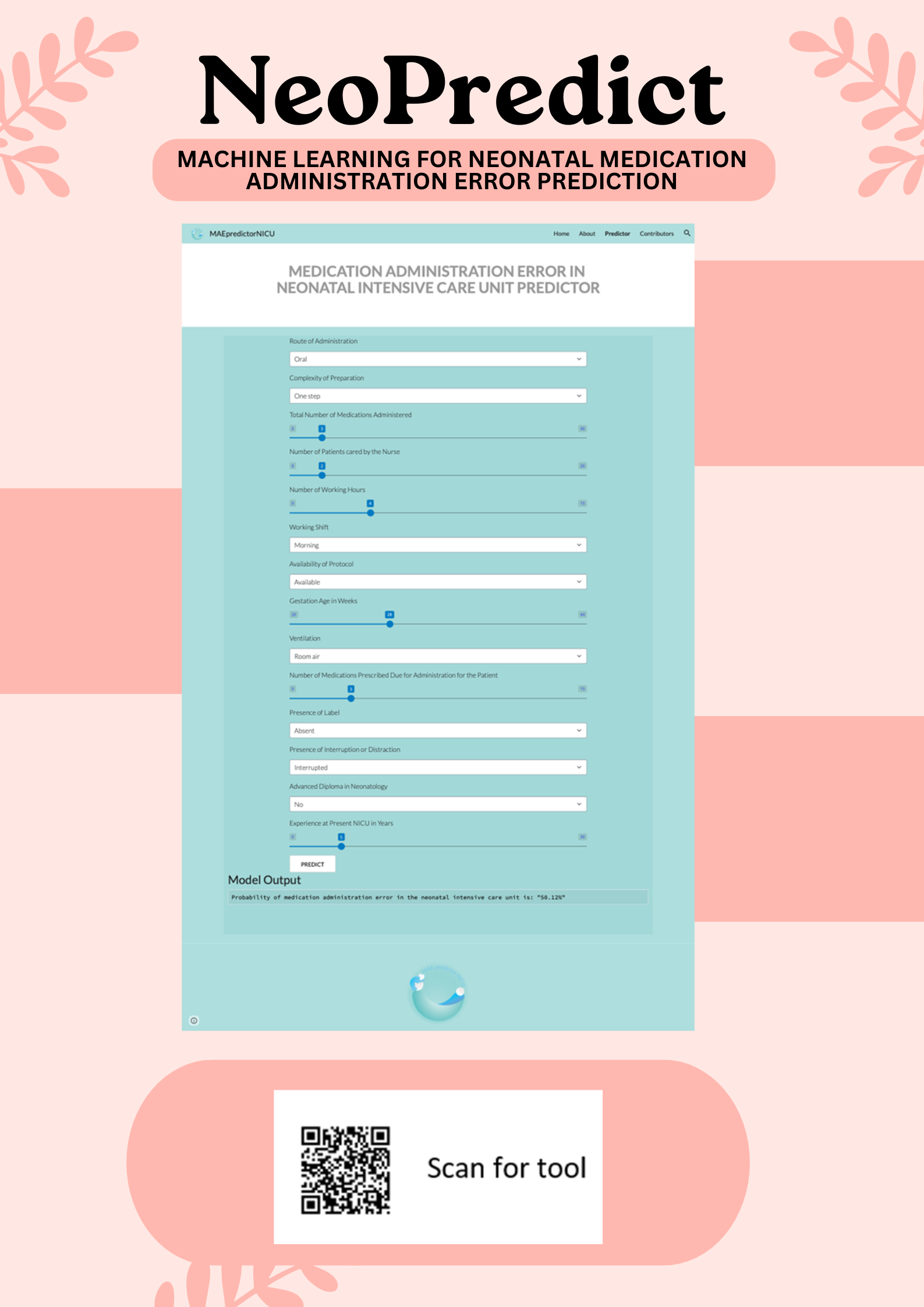 We developed the world’s first web-based predictor tool that uses machine learning to assess the risk of medication administration errors among neonates in NICUs. By analyzing key clinical and medication-related factors, the tool provides real-time risk predictions to support clinicians in preventing errors. This innovation enhances patient safety, strengthens clinical pharmacy practice, and promotes data-driven, proactive care for the most vulnerable patients.