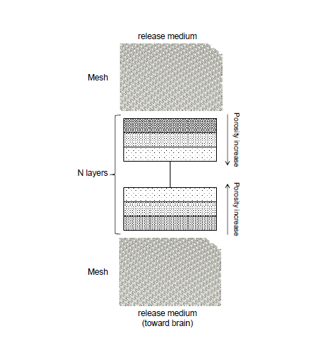 This patent describes a biocompatible medical device that include two supported meshes for providing mechanical strength and osseointegration properties of the implant, and a multiplayer porous material in between them that is loaded with the required bioactive antibacterial compound to promote a controlled and sustained release of the pharmaceutical agents at the site of surgical intervention. Meshes are designed with an open structure and coated with biocompatible materials .