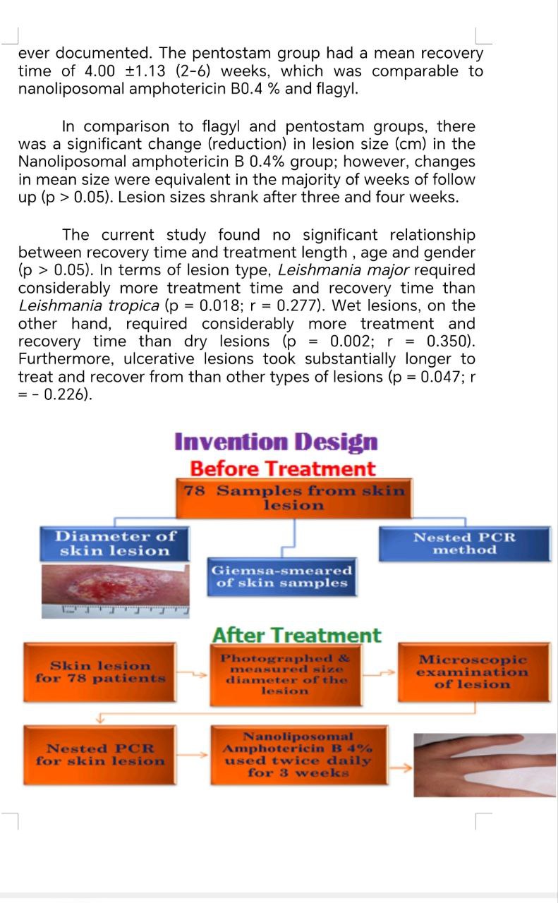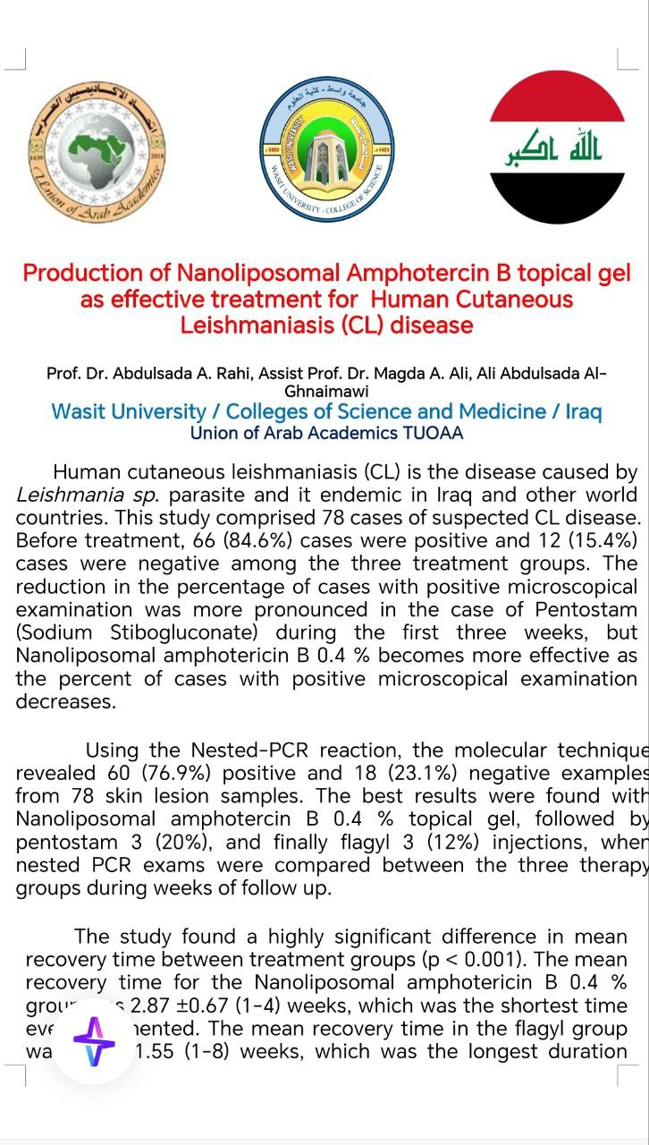 Human cutaneous leishmaniasis (CL) is the disease caused by Leishmania sp. parasite and it endemic in Iraq and other world countries. This study comprised 78 cases of suspected CL disease. The reduction in the percentage of cases with positive microscopical examination was more pronounced in the case of Pentostam during the first three weeks, but Nanoliposomal amphotericin B 0.4 % becomes more effective as the percent of cases with positive microscopical examination decreases.