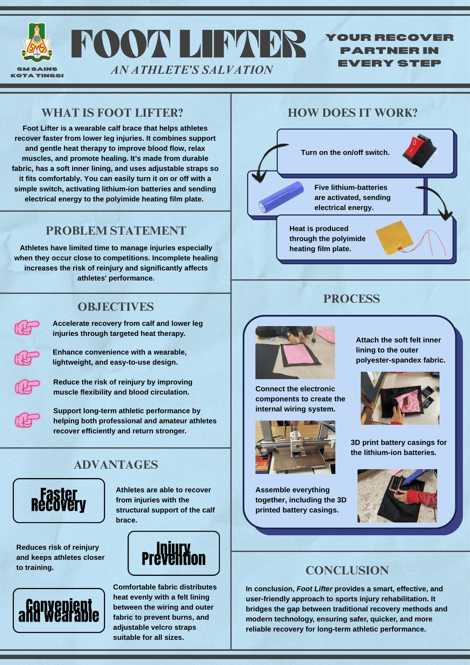 Foot Lifter is an innovative wearable calf brace that provides targeted heat therapy and structural support to accelerate lower leg injury recovery. Powered by rechargeable batteries, it improves blood circulation, reduces pain, and prevents reinjury. Made with durable, heat-resistant materials and adjustable straps for comfort, Foot Lifter offers athletes an efficient, portable, and reliable solution for faster, safer recovery and enhanced performance.
