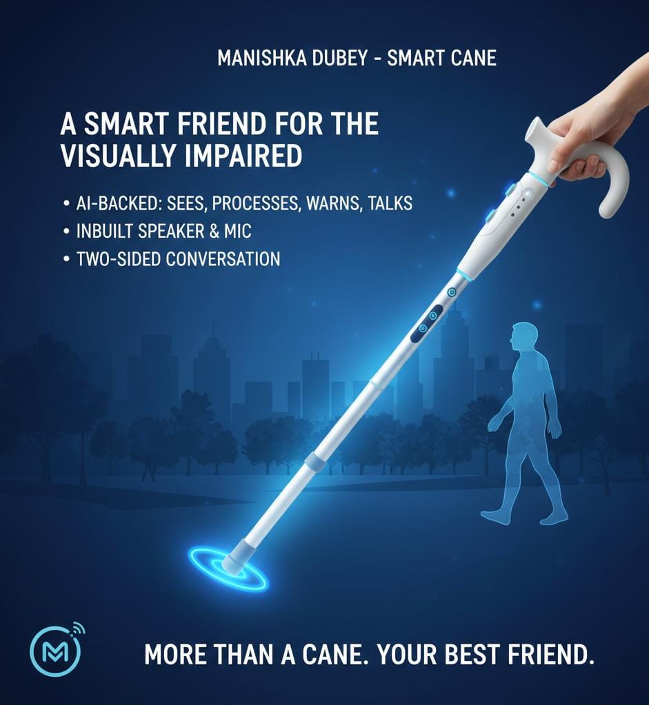 A smart friend (cane) for the visually impaired. Backed by AI, it will see, process, warn and talk to its master. With inbuilt speakers, mic and Bluetooth provision, the conversation is always two sided! It's not just a cane, it's the master's best friend.