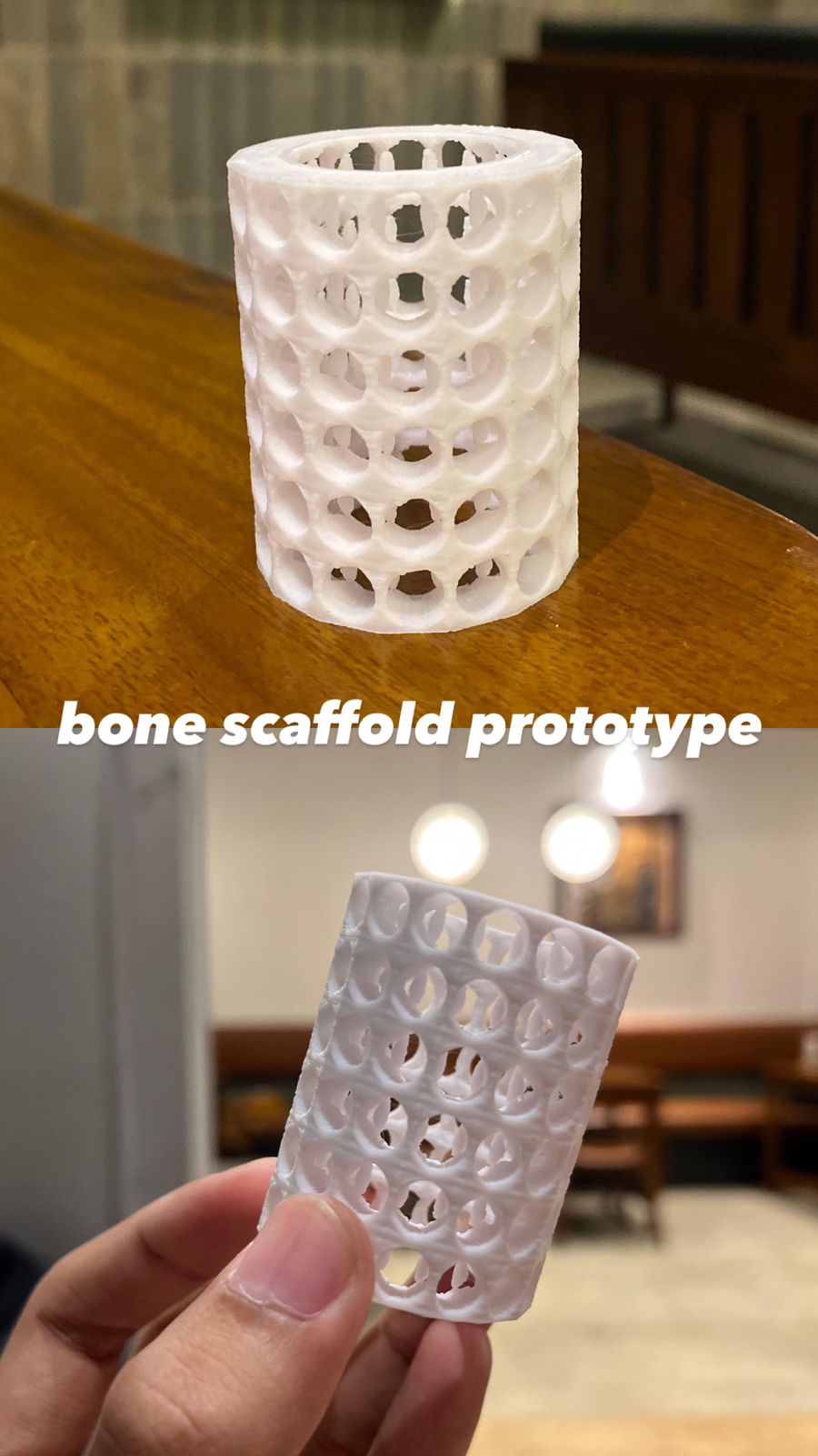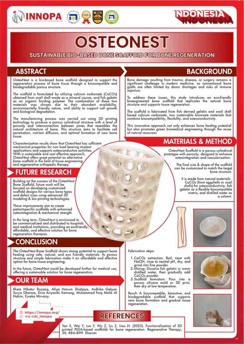 OsteoNest is an innovative eco friendly bone scaffold designed to support the regeneration of bone tissue. It is developed using snail shell waste as a natural source of calcium carbonate (CaCO₃) and fish gelatin as an organic binding polymer. This combination of materials was selected due to their abundant availability, biocompatibility, biodegradability, and ability to promote cell growth and biological degradation. The fabrication process employs 3D printing technology, producing a porous