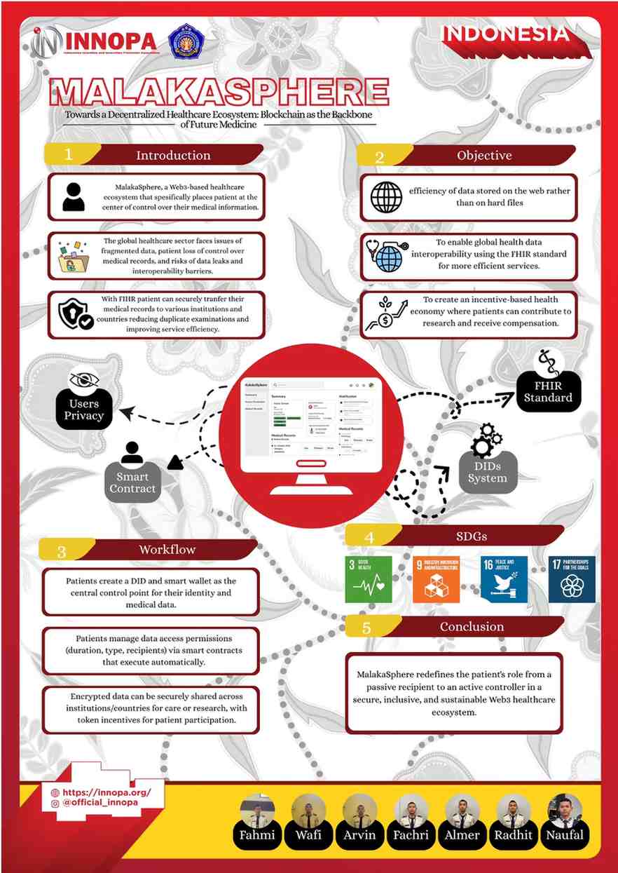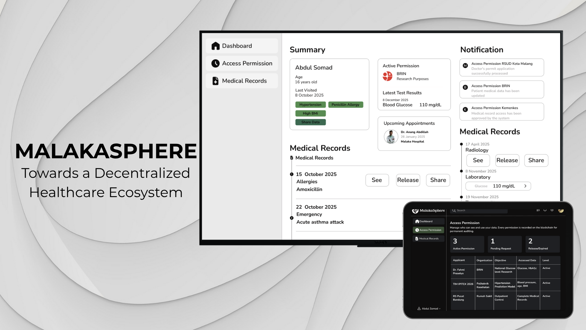 MalakaSphere is a Web3-based healthcare ecosystem that empowers patients to own and control their medical data securely. Using Decentralized Digital Identity (DID), smart contracts, and FHIR standards, it enables global data interoperability and privacy. Patients can share data transparently, earn tokens for research participation, and access healthcare services. Built with encryption and Proof of Stake, MalakaSphere promotes trust, innovation, and sustainability in global healthcare.