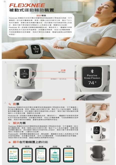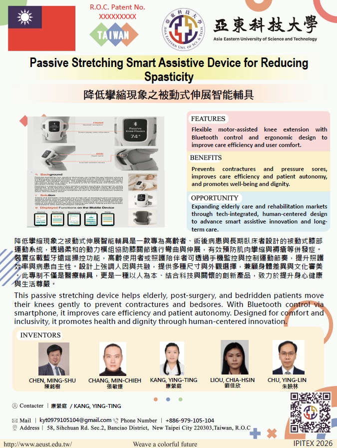The passive stretching smart assistive device for reducing contracture is a knee motion system specifically designed for the elderly, post-operative patients, and long-term bedridden individuals. Utilizing a gentle power module, it assists in the passive flexion and extension of the knee joint, effectively preventing complications such as muscle contractures and pressure ulcers. Equipped with Bluetooth remote control functionality, the device allows users or caregivers to monitor and adjust the