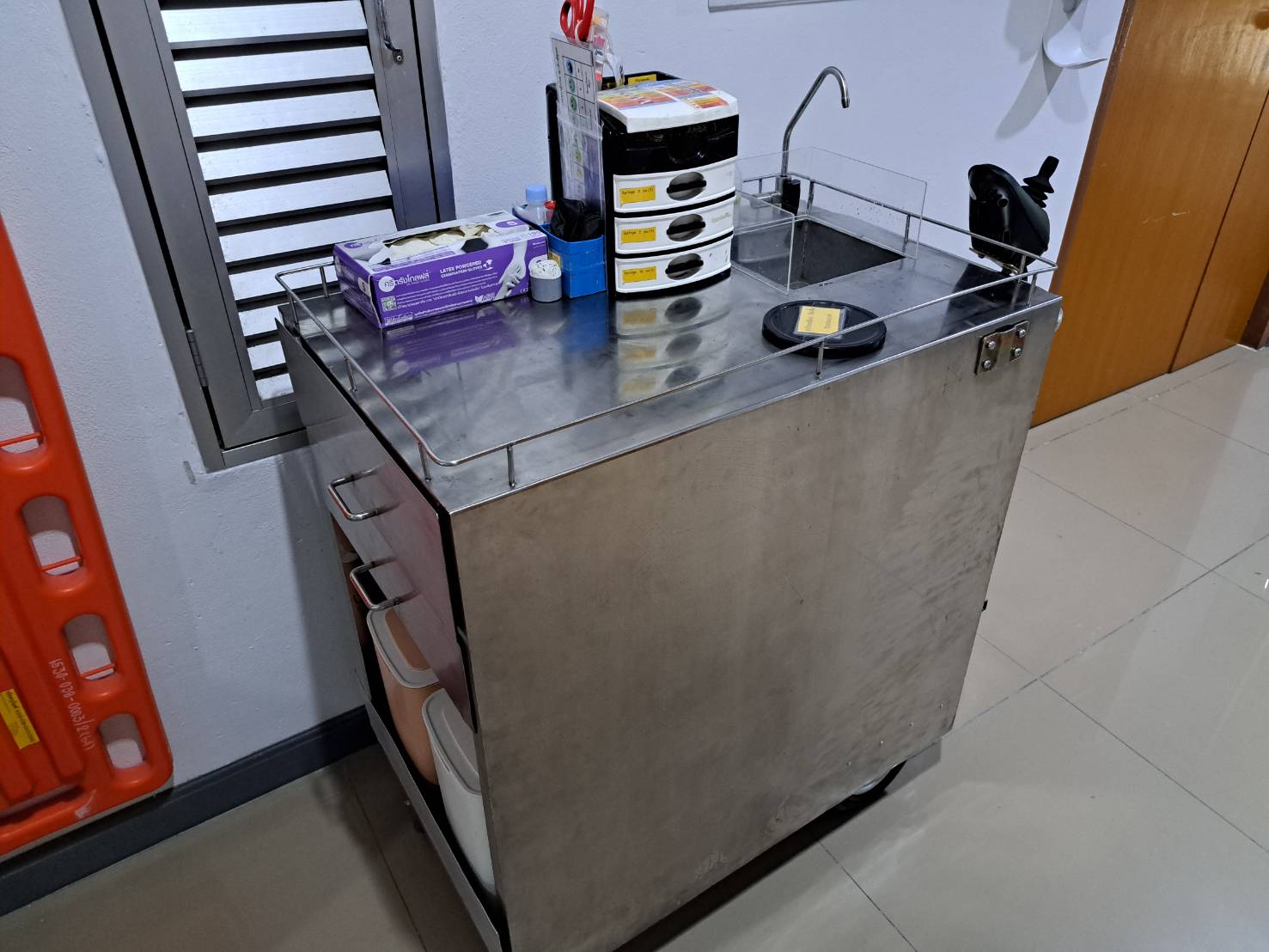 This invention is a stainless-steel medical procedure cart designed to enhance safety and reduce infection risks. It features an automatic-sensor sink, touchless trash bins, storage drawers, and an electric motor drive controlled by a joystick, providing convenient, hygienic, and efficient operation.