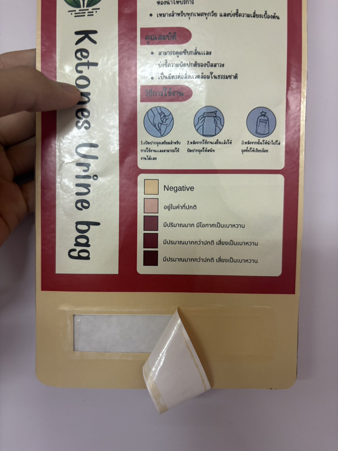 The urine absorbent material is synthesized from carboxymethyl cellulose (CMC) derived from water hyacinth and polyvinyl alcohol (PVA) using the freeze–thaw technique. It detects ketone levels in urine by adding a sodium nitroprusside solution and is designed for use with a portable urine bag. It is biodegradable, environmentally safe, and offers an innovative alternative absorbent material.