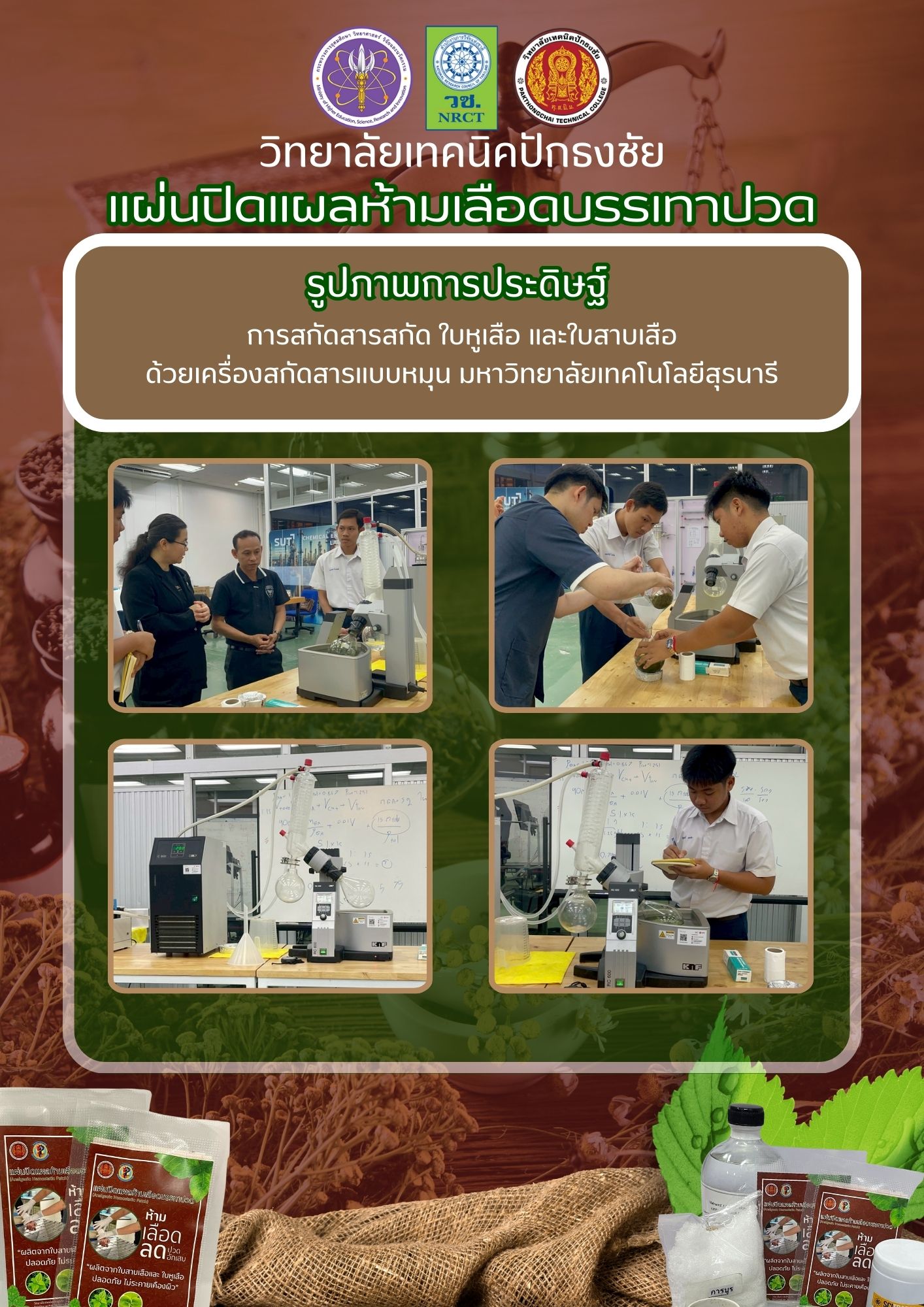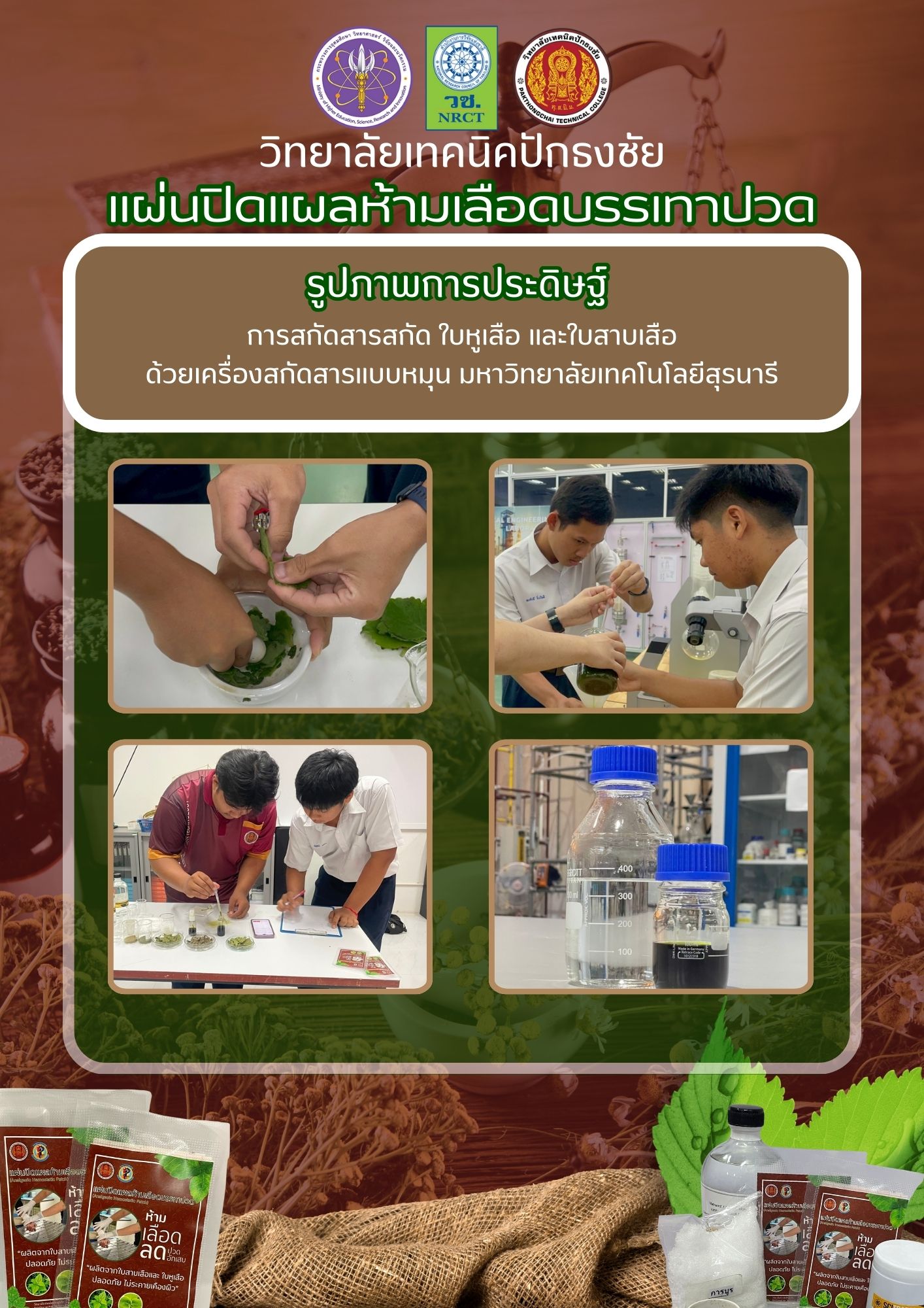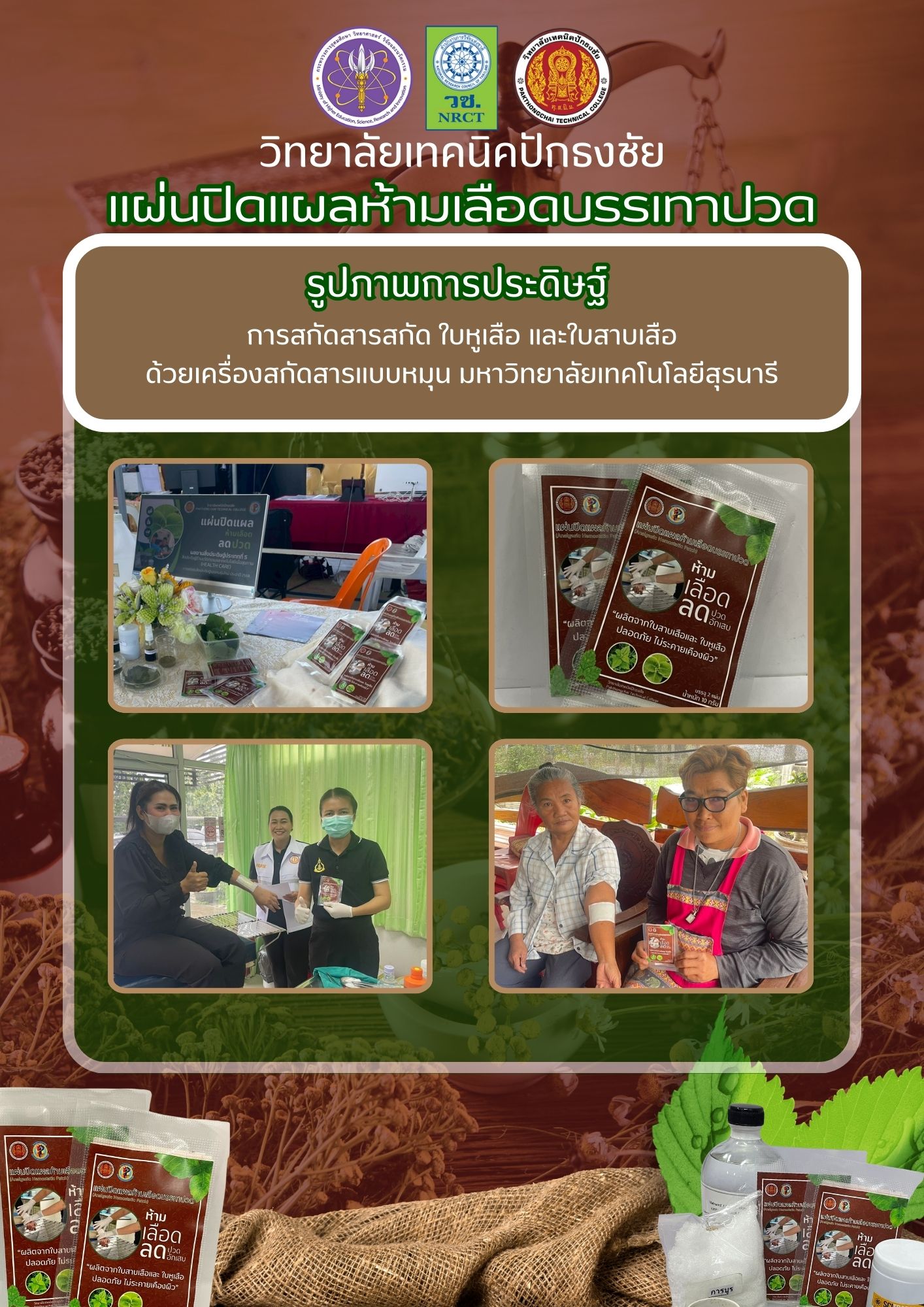The wound patch contains extracts of Siam weed leaves, Indian borage leaves, and camphor in a ratio of 1 : 1 : 0.2 at 30% w/v. It is a thin sheet that can be applied directly to a wound. Indian borage extract is the most effective at promoting blood clot formation, while Siam weed extract helps blood coagulate quickly, making the patch effective for stopping bleeding.