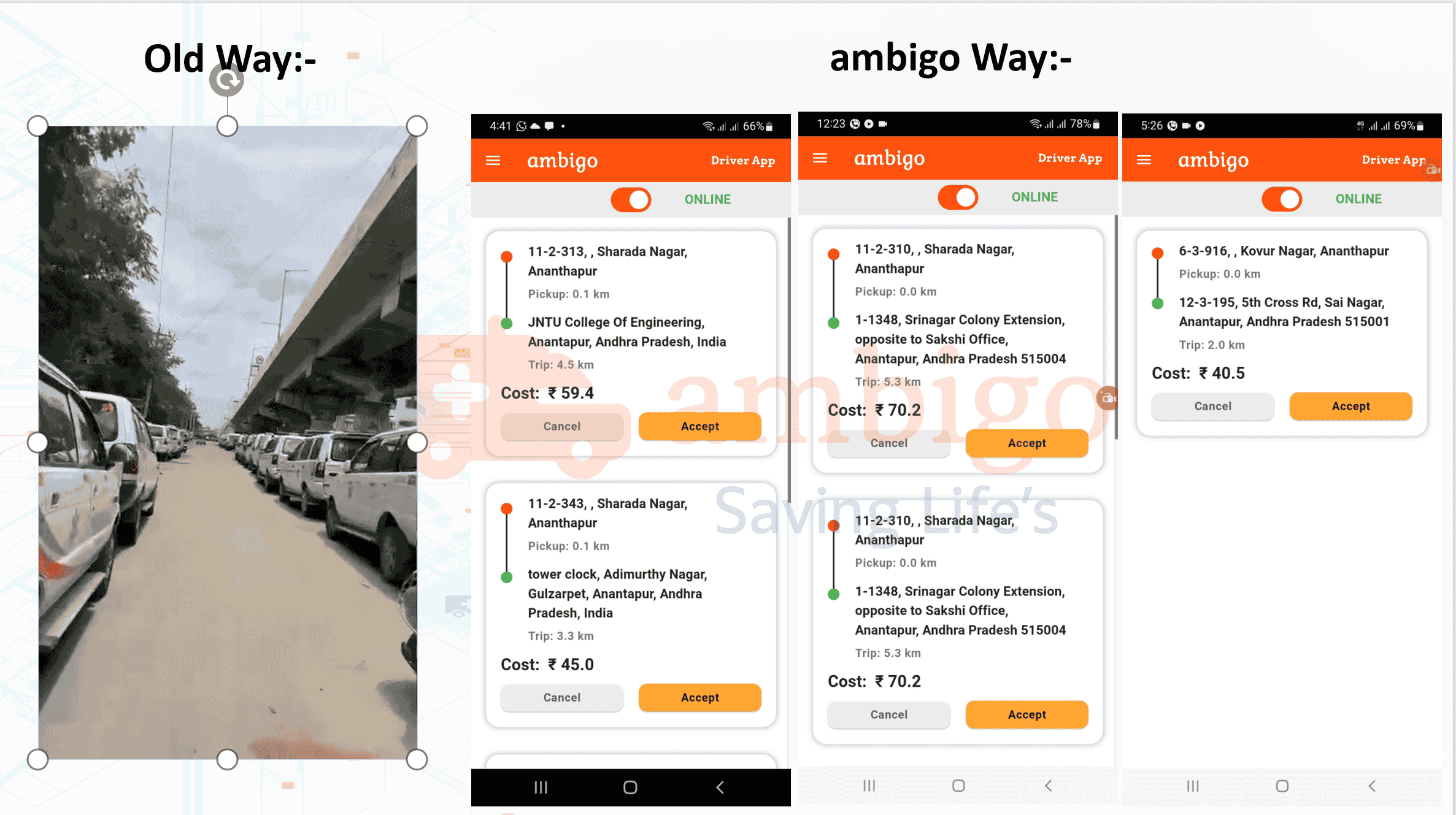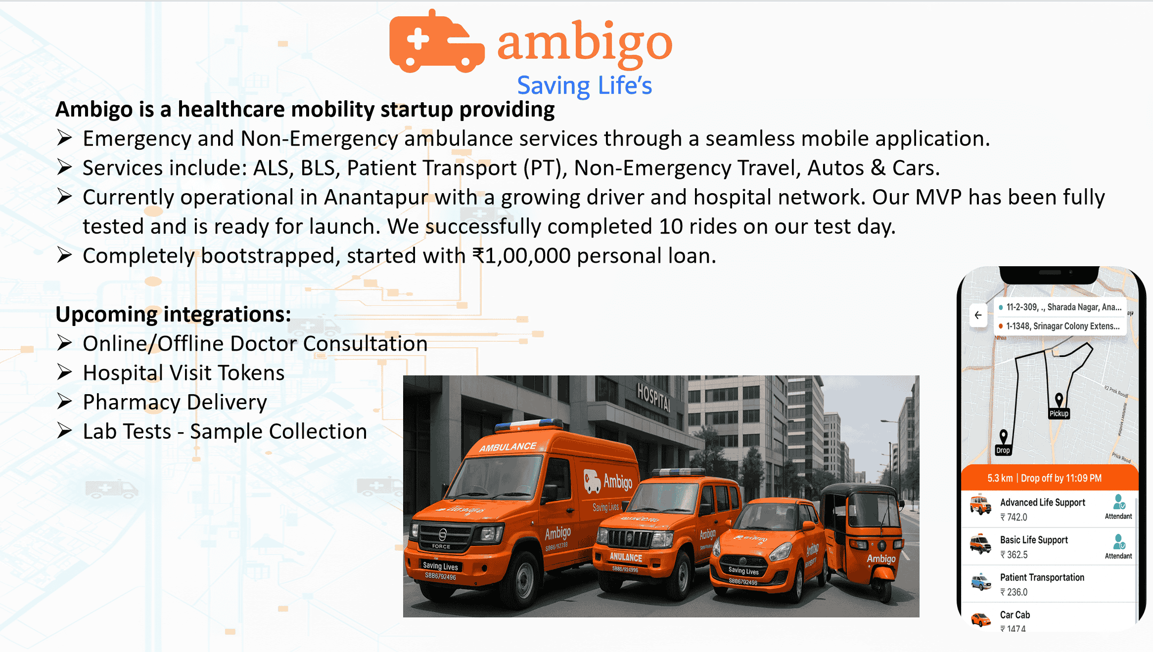 Ambigo is a technology-driven Healthcare Mobility and Emergency Response Platform designed to bridge the gap between patients, ambulances, hospitals, and essential medical services. The invention integrates real-time ambulance booking, location-based dispatching, and healthcare service aggregation into a single mobile application. The platform provides on-demand Emergency and Non-Emergency medical transportation, including ALS, BLS, Patient Transport ambulances, medical autos, and medical cars.