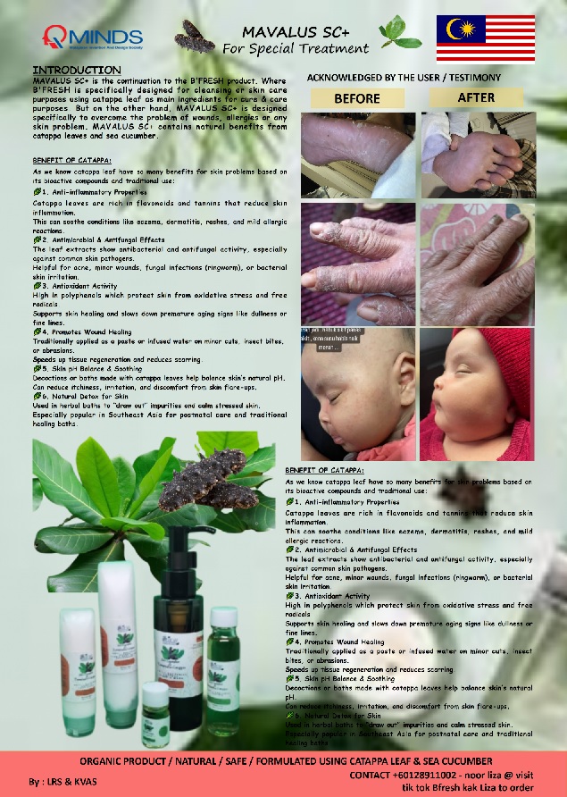 Mavalus sc+ is the continuation to the B'FRESH product. Where B'FRESH is specifically designed for cleansing or skin care purposes using catappa leaf as main ingredients for cure & care purposes. But on the other hand, MAVALUS SC+ is designed specifically to overcome the problem of wounds, allergies or any skin problem. MAVALUS SC+ contains natural benefits from catappa leaves and sea cucumber.