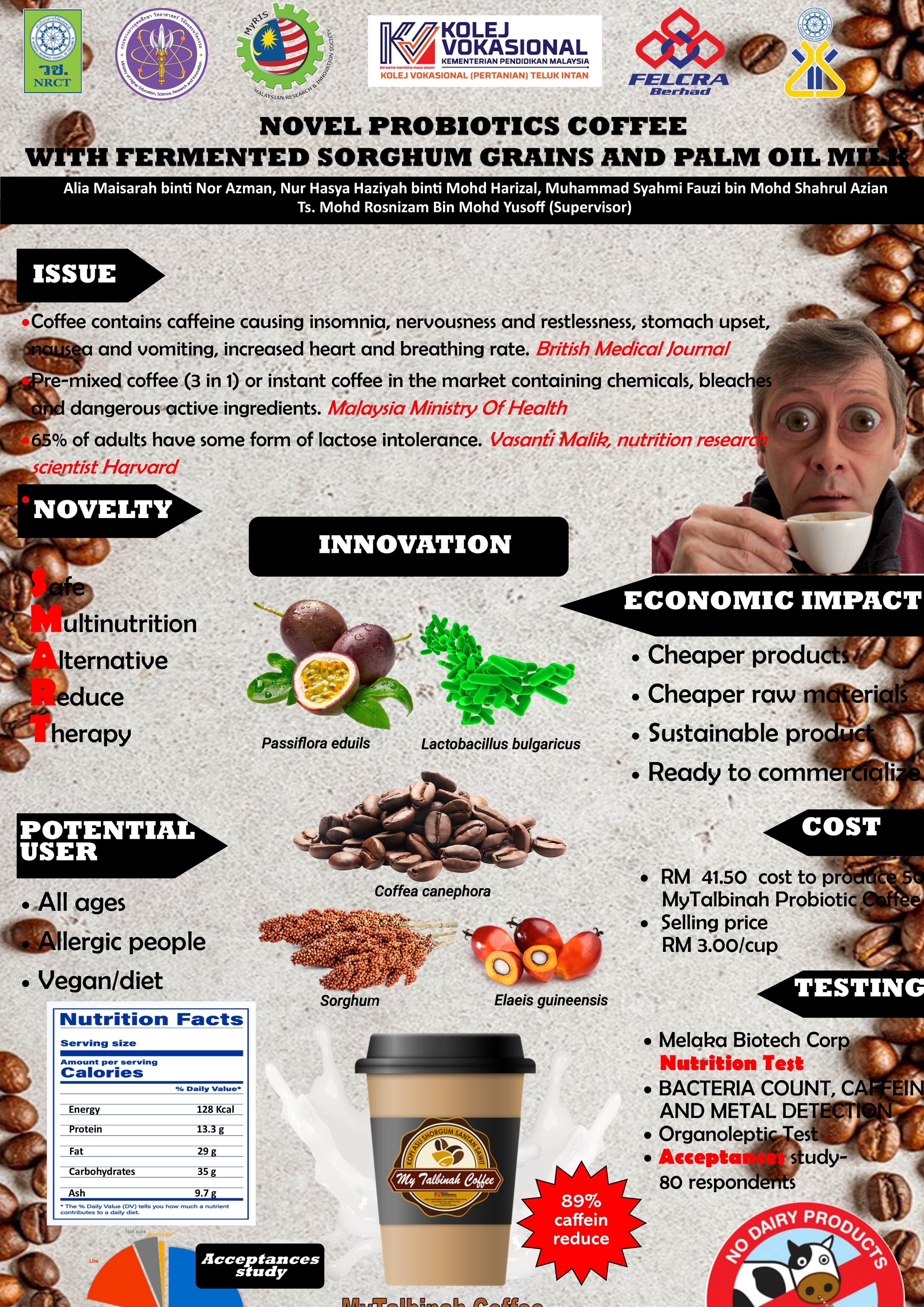 MyTalbinah Coffee is a patented probiotic coffee fermented with Lactobacillus bulgaricus and sorghum, reducing caffeine by 89% while enhancing flavor, safety, and shelf life. Enriched with palm-based coconut milk powder, it’s lactose-friendly, energy-rich, and 85% consumer-approved. This ready-to-drink innovation blends wellness, technology, and sustainability in every cup.