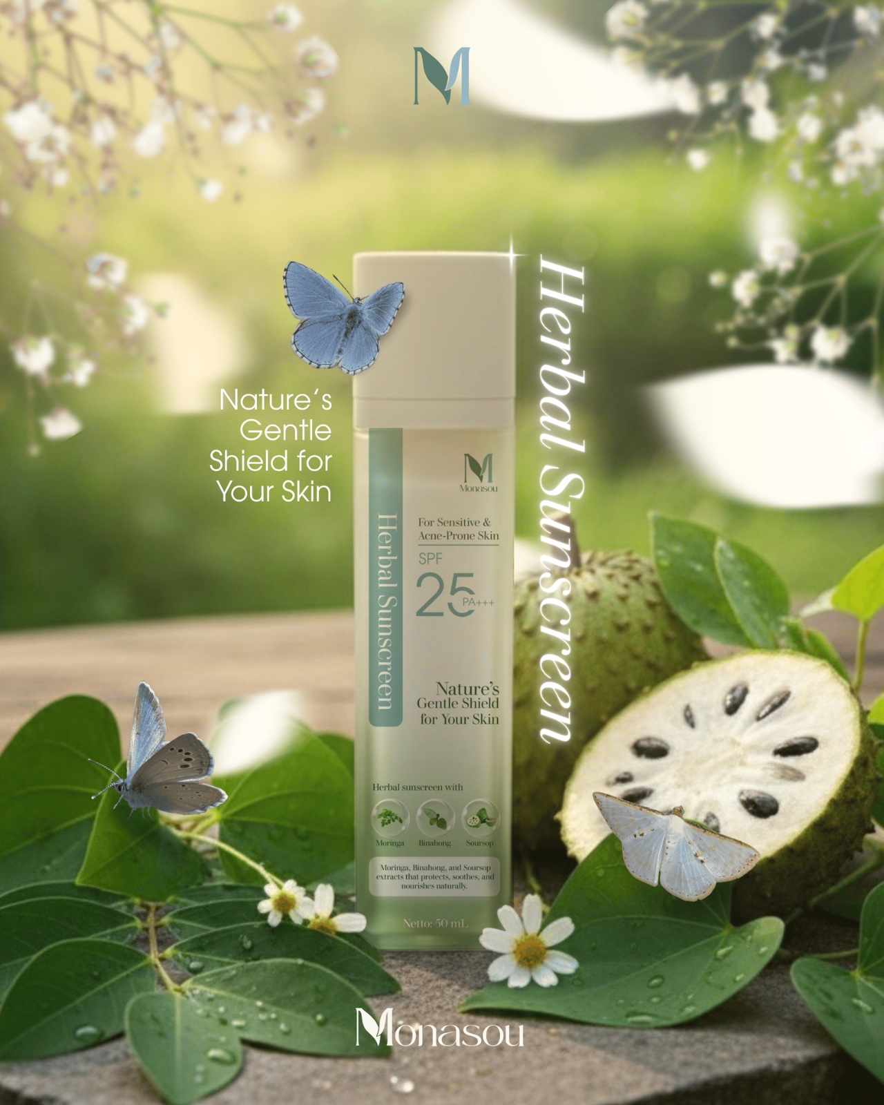 MONASOU is a herbal sunscreen innovation specially designed to meet the skincare needs of Asian people living in tropical regions with intense year-round sunlight exposure. Such environmental conditions increase the risk of hyperpigmentation, acne, and premature aging, thereby requiring a sunscreen that provides high protection while remaining gentle and safe for sensitive skin. MONASOU is formulated from a unique combination of natural extracts derived from moringa (Moringa oleifera).