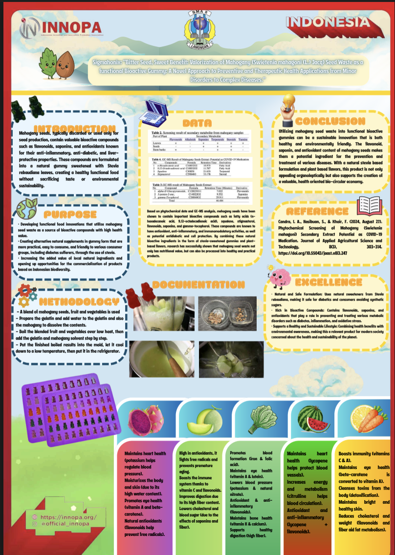 The increasing global burden of lifestyle-related diseases and industrial waste highlights the urgent need for sustainable and health-oriented innovations. This study presents a novel approach to valorizing mahogany seed waste (Swietenia mahagoni) an underutilized byproduct of the timber industry, by developing bioactive functional gummies with preventive and therapeutic potential. Mahogany seeds, often discarded or used solely for replanting, contain valuable bioactive compounds such as flavono