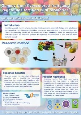 Gummy from five colored fruits and vegetables that’re made by yellow color from wild ginger , green color from Malindjo leaves , red color from Eleutherine palmifolia (L.) Merr , purple color from mulberry and white color from light mango and tortified with probiotics which have properties to help balance the microflora in the intestine, resulting in the digestive system working effectively
