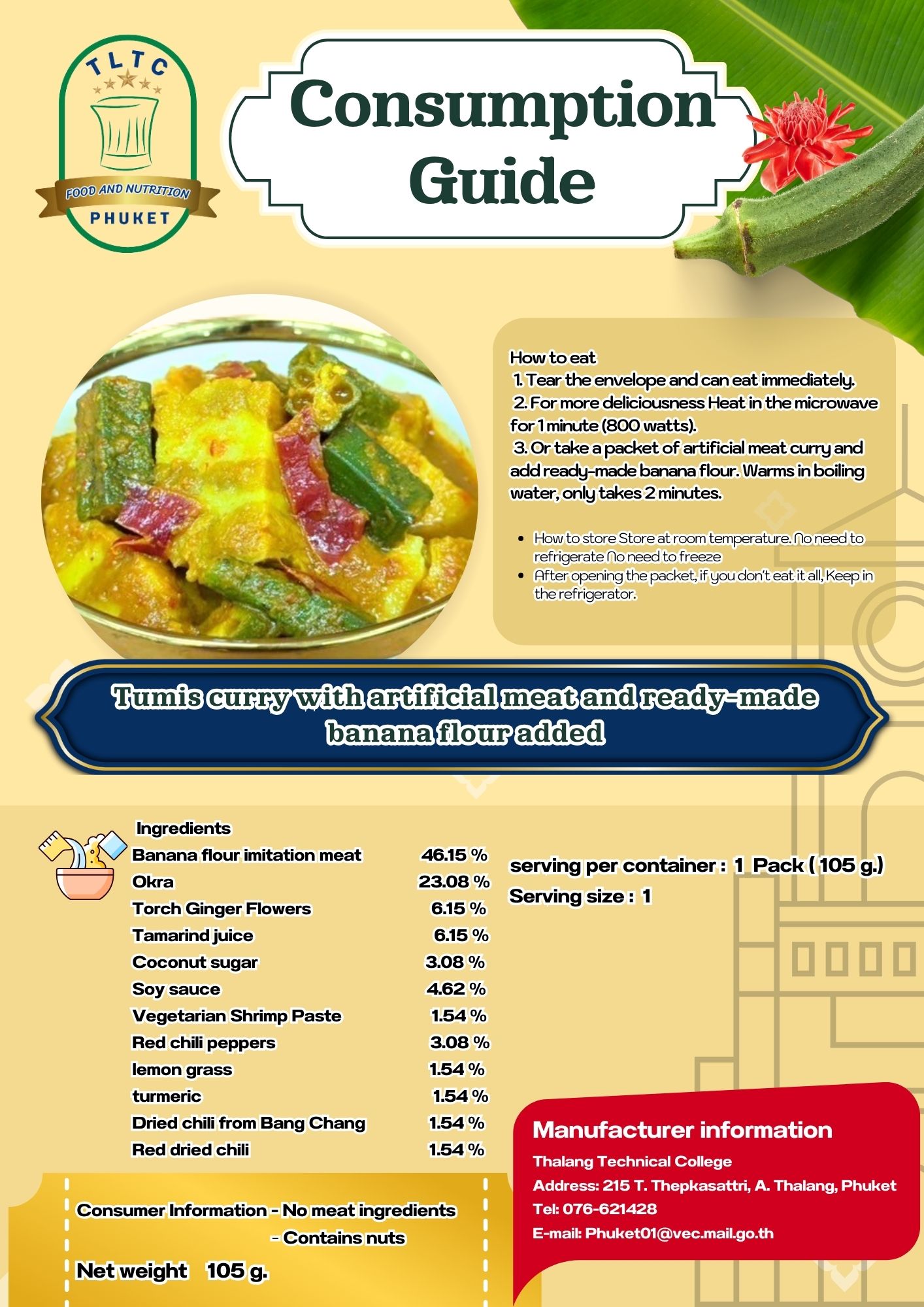 An innovative ready-to-eat plant-based Tumis curry, a traditional Southern Thai dish. Features artificial meat enriched with local banana flour for enhanced nutrition and texture. Utilizes retort pouch technology with heat sterilization for extended shelf life at room temperature. Provides a convenient, healthy alternative for vegetarians, vegans, and health-conscious consumers while promoting local ingredients and sustainable food production