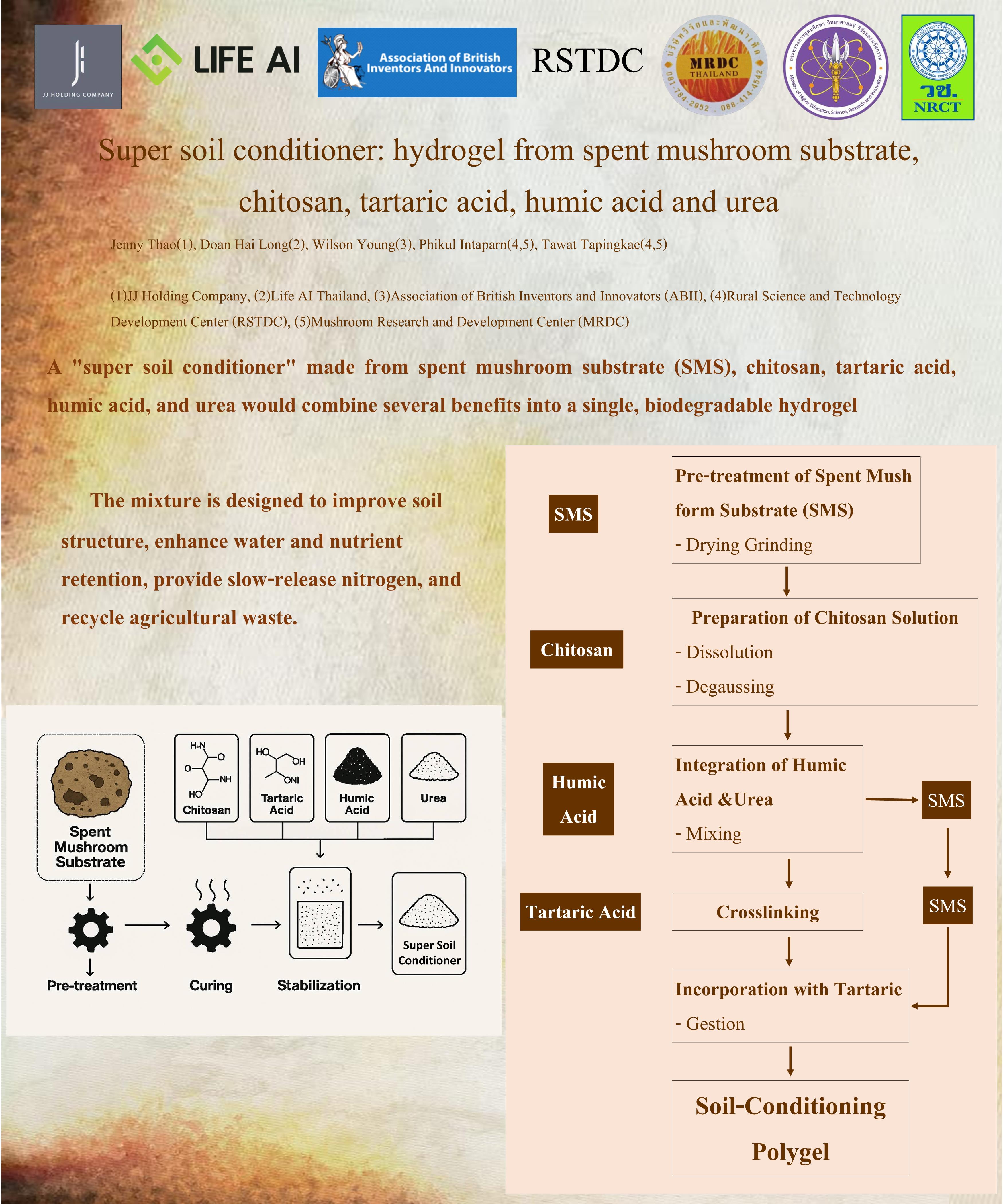A "super soil conditioner" made from spent mushroom substrate (SMS), chitosan, tartaric acid, humic acid, and urea would combine several benefits into a single, biodegradable hydrogel . The mixture is designed to improve soil structure, enhance water and nutrient retention, provide slow-release nitrogen, and recycle agricultural waste.