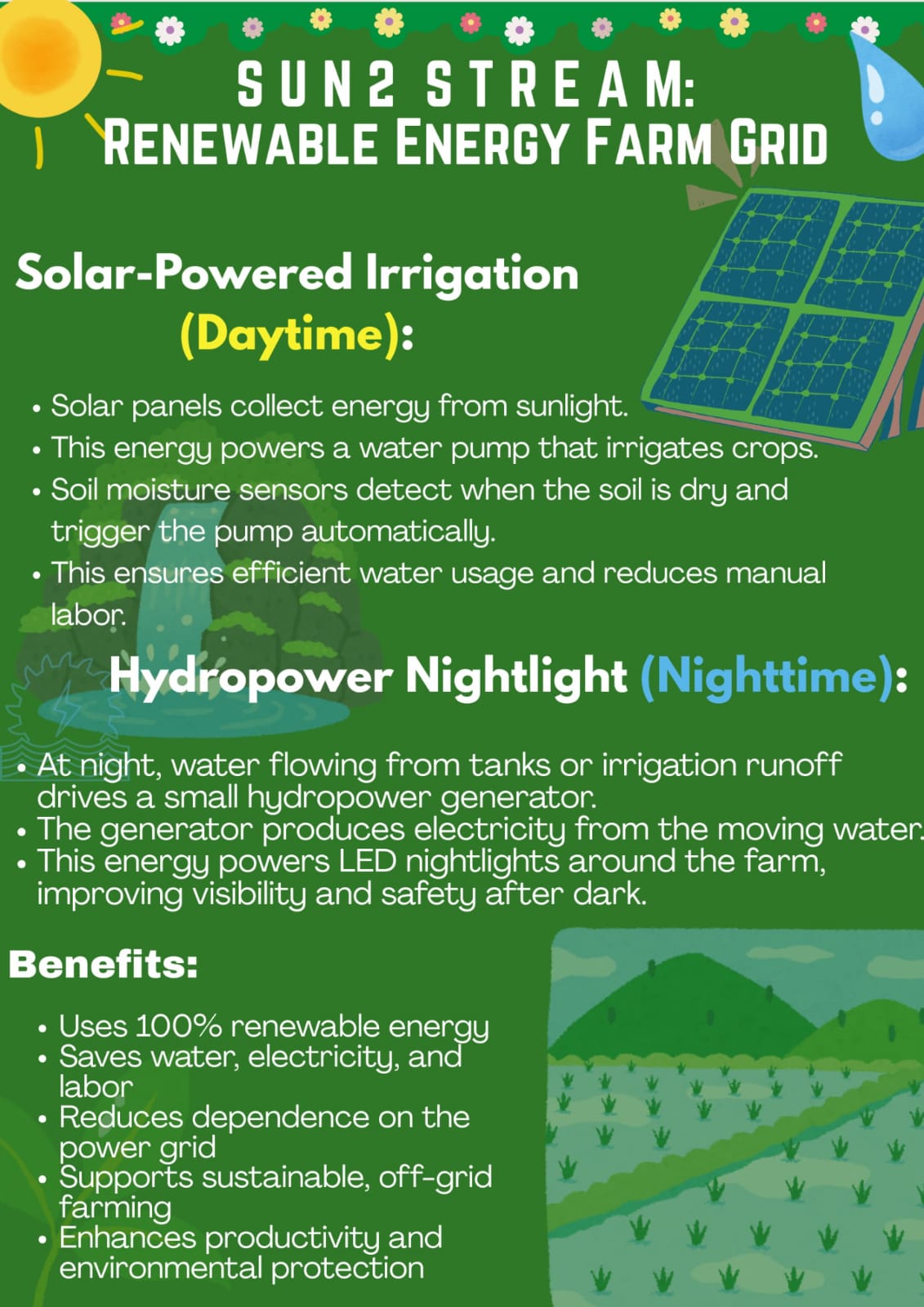 This system is ideal for rural areas, small farms and environmentally conscious agricultural projects. It provide a smart way to grow crops while protecting natural resources-using the power of the sun and water.