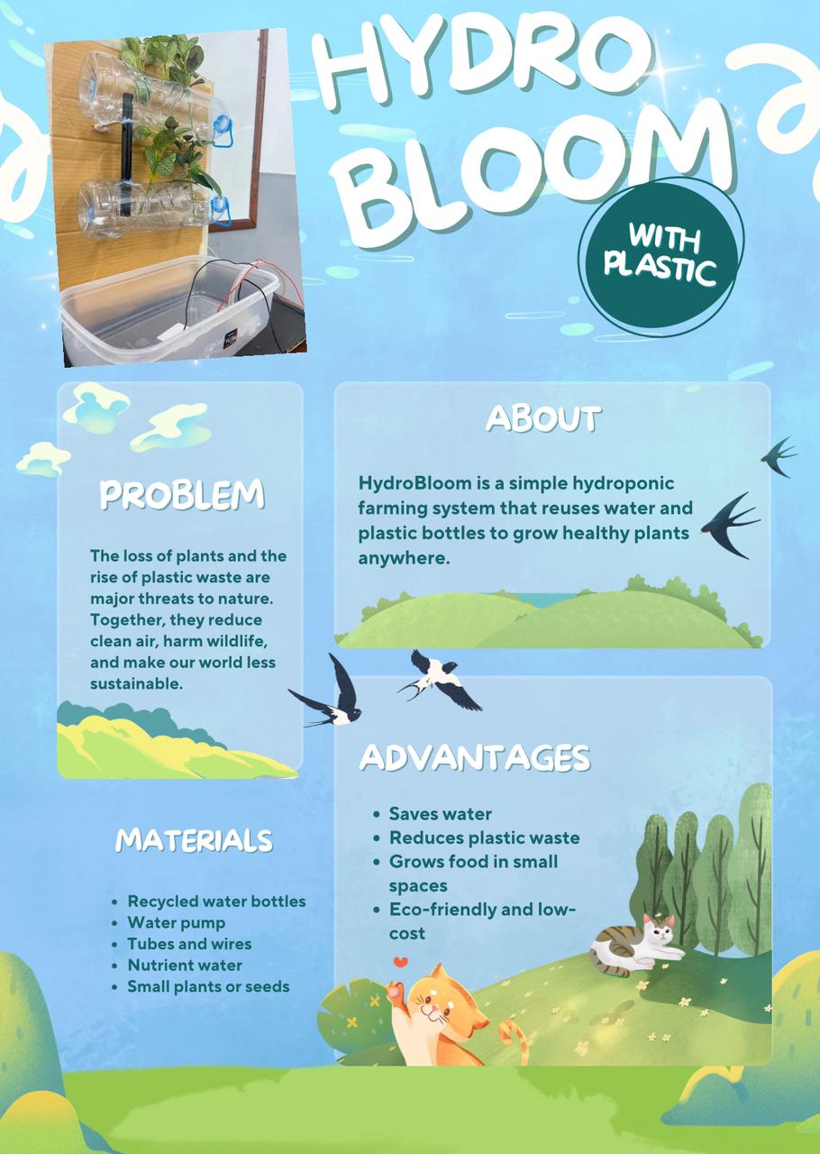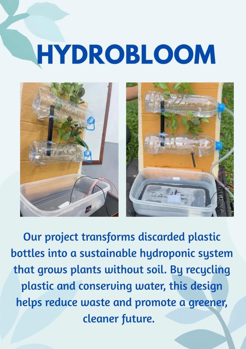 Our project transform discarded plastic bottles into sustainable hydroponic system that grows plants without soil. By recycling plastic and conserving water, this design helps reduce waste and promote a greener, cleaner future