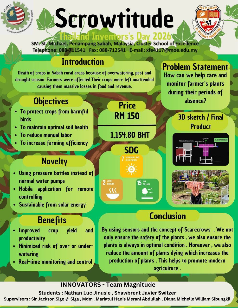 Scrowtitude is a solar-powered smart farming system that protects crops from birds using a green laser deterrent while monitoring soil moisture with advanced sensors. A bottle on its arm increases spray distance. Connected to a mobile app, it lets farmers track soil, adjust watering, and control functions remotely. Combining automation, sustainability, and precision, Scrowtitude boosts productivity and supports SDG2 (Zero Hunger), SDG7 (Clean Energy), and SDG15 (Life on Land).