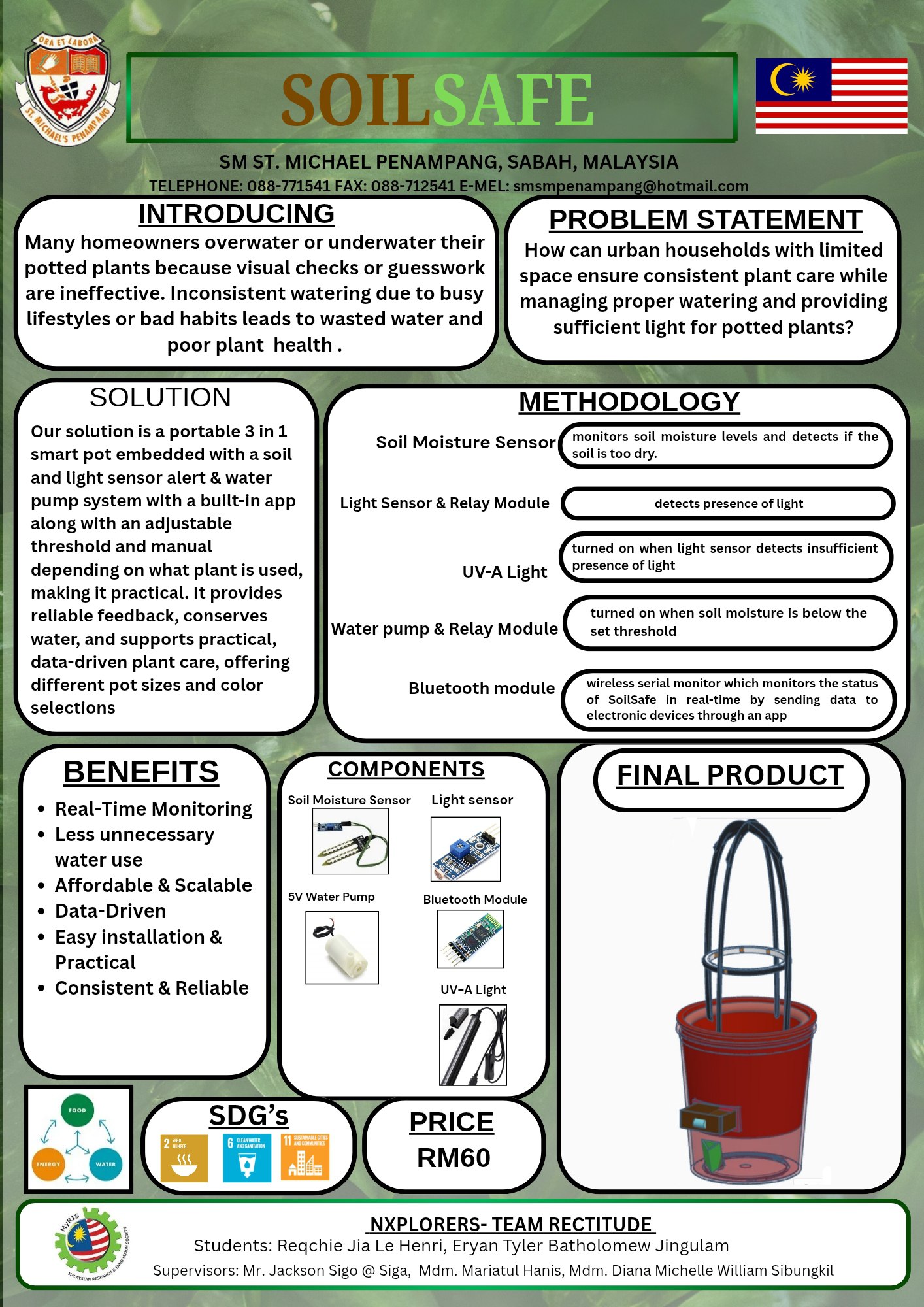 A portable 3-in-1 smart pot system that simplifies indoor plant care and promotes water efficiency. It combines a soil sensor alert, automated water pump, and mobile app with adjustable settings for customized watering. Using soil and water level sensors, it activates the pump when moisture drops below set thresholds and alerts users when water is low. A light sensor triggers UV-A light when needed. Supporting SDG 2, 6, 11, SoilSafe encourages smart, sustainable, and eco-friendly plant care.
