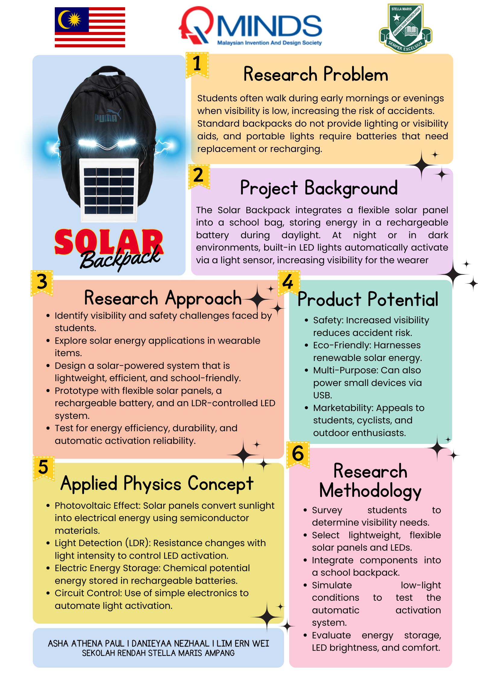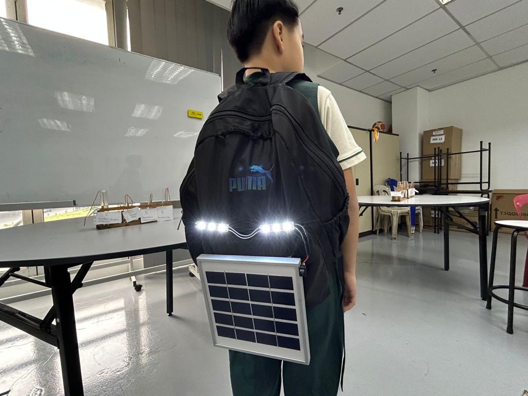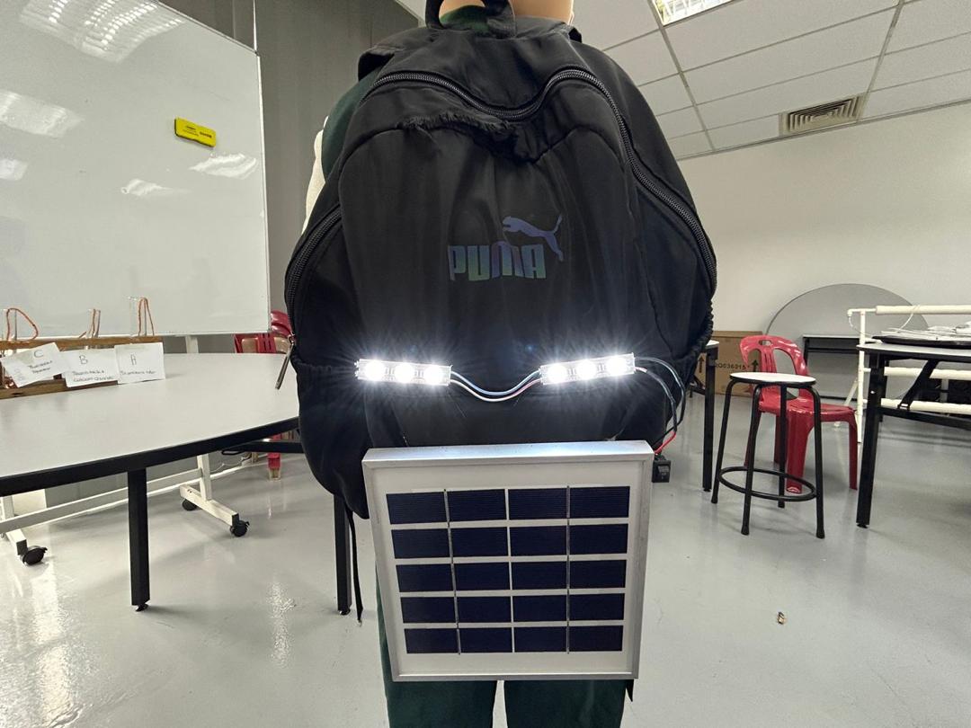 The Solar Backpack is a school bag equipped with a solar panel that stores energy during the day and automatically powers built-in lights when it gets dark. Its novelty lies in being a special school bag that provides extra light when needed. When visibility is low, the user can turn on the LEDs on the backpack. Additional features include a built-in rechargeable battery and an LDR (Light Dependent Resistor) that monitors surrounding brightness.