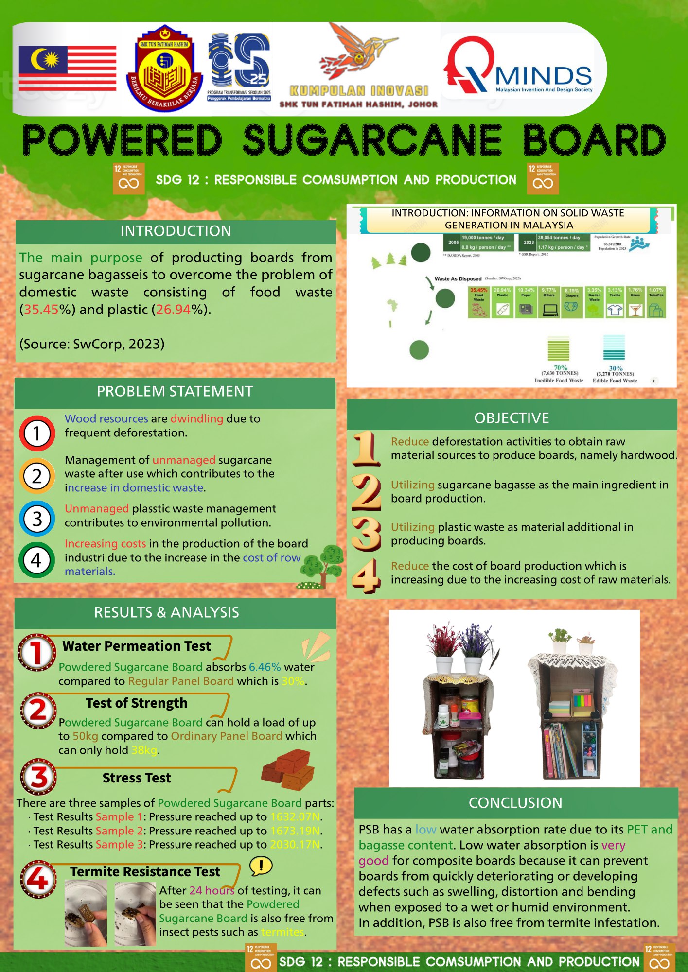 The innovative product Powdered Sugarcane Board (PSB) is a fiberboard product that has been produced from sugarcane bagasse. Sugarcane bagasse is a waste product resulting from the sugarcane juice extraction process. Sugarcane bagasse is a fiber that has characteristics such as thick, tough, strong and has high abrasion resistance, among the factors in the selection of materials for this innovation project in line with SDG 12 standards: Responsible Consumption and Production. Along with ecologic