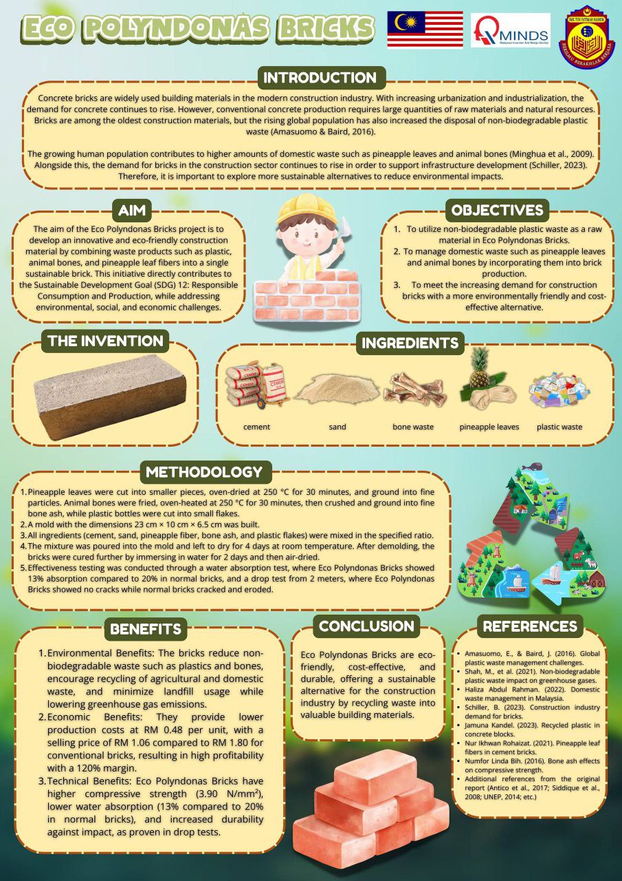 The Eco Polyndonas Bricks innovation project produces bricks by incorporating selected waste materials such as plastic, bone residues, and pineapple leaf fibers. This initiative supports Sustainable Development Goal (SDG) 12: Responsible Consumption and Production. The main objective of the project is to provide a sustainable alternative to traditional bricks by prioritizing waste management and resource efficiency. The bricks were tested through compressive strength analysis, water absorption r