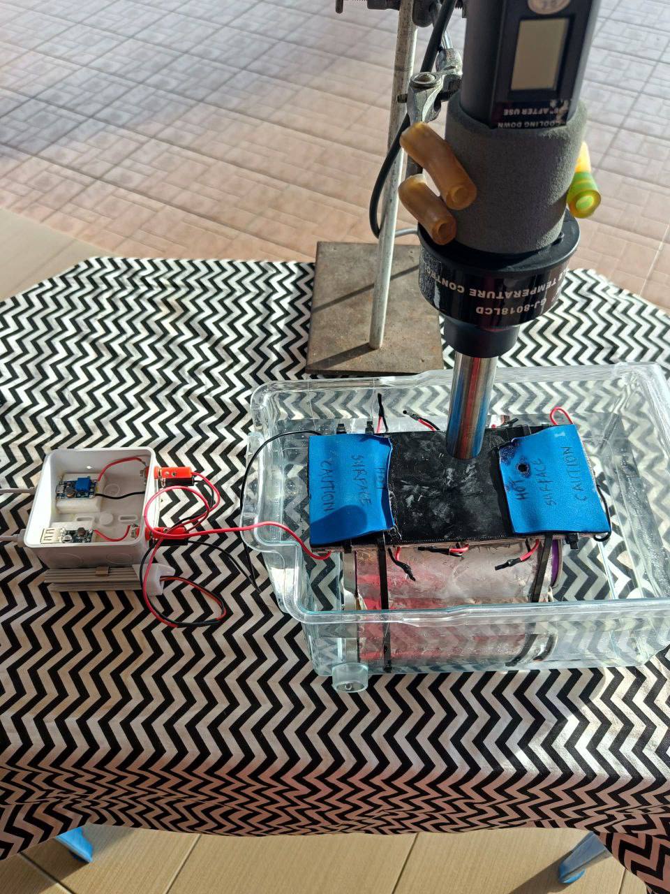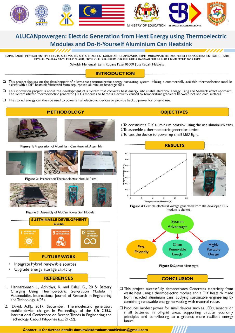 This innovation project is about the development of a system that converts heat energy into usable electrical energy using the Seebeck effect approach. The generated electricity is then used to power up a LED light. The system utilized thermoelectric generator (TEG) modules to harness electricity caused by temperature gradients between hot and cold surfaces. Akey feature of the design is the integration of a custom-built heatsink made from recycled aluminium cans, which effectively remove heat f