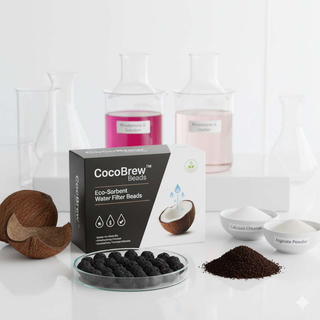 CocoBrew upcycles coconut shell chips and spent coffee grounds into porous composite beads that remove Rhodamine B from water. The coffee–coconut biochar provides aromatic carbon for π–π stacking, while the alginate–clay matrix gives strength and porosity. Beads are easy to make, reusable, low-cost, and demonstrate circular green technology for community water protection (SDG 6 & 12).