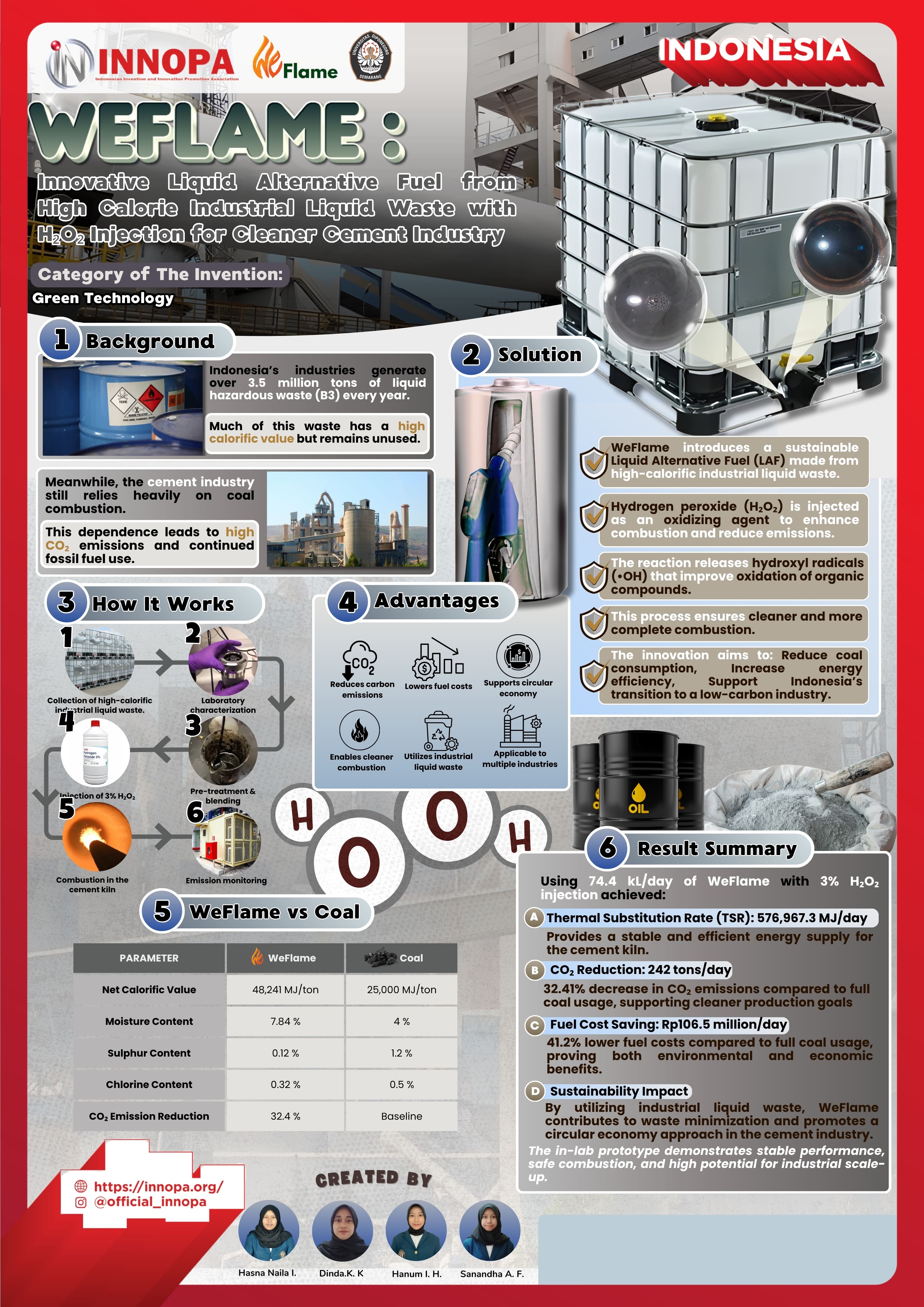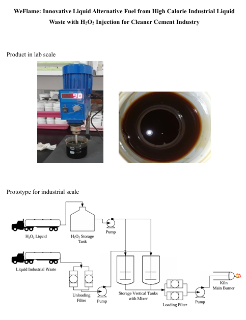 WeFlame is an innovative Liquid Alternative Fuel (LAF) designed to convert high-calorific industrial liquid waste into a clean and efficient energy source for cement kiln combustion. This product represents a breakthrough in sustainable energy utilization, addressing the dual challenge of reducing hazardous waste while lowering the carbon footprint of cement production. To enhance combustion efficiency and minimize emissions, WeFlame incorporates hydrogen peroxide (H2O2) as an oxidizing agent.