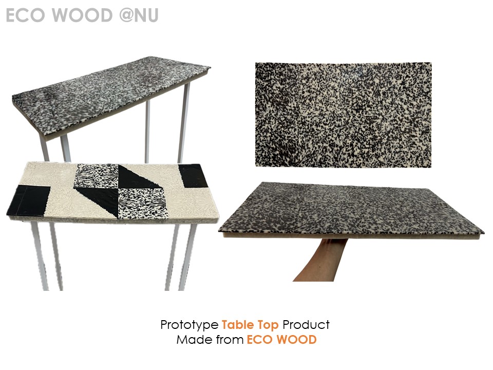 This innovation involves the development of a high-value composite wood panel made from recycled plastics combined with spent coffee grounds, eggshell waste, and rice straw. It is designed for sustainable application as a table top material in the furniture industry. Post-consumer waste is transformed into an engineered material that offers high strength, light weight, moisture resistance, and improved mechanical properties compared with conventional wood substitutes. The technology de