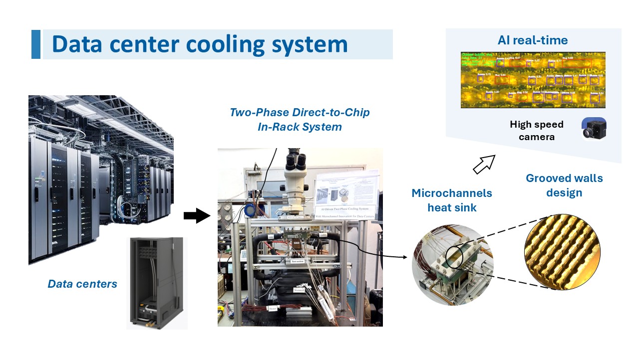 This innovation presents an AI-driven two-phase direct-to-chip cooling system featuring a grooved-wall microchannel design that increases surface area, enhances temperature uniformity, and mitigates hot spots without raising pressure drop. With intelligent real-time bubble detection and adaptive flow control, the system delivers superior heat transfer performance and significant energy savings for future sustainable data centers.