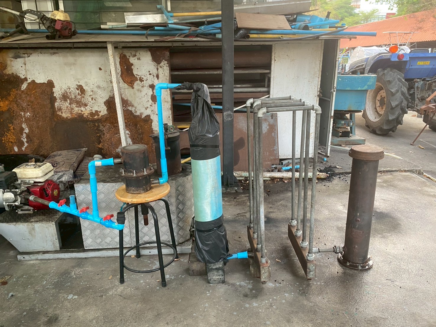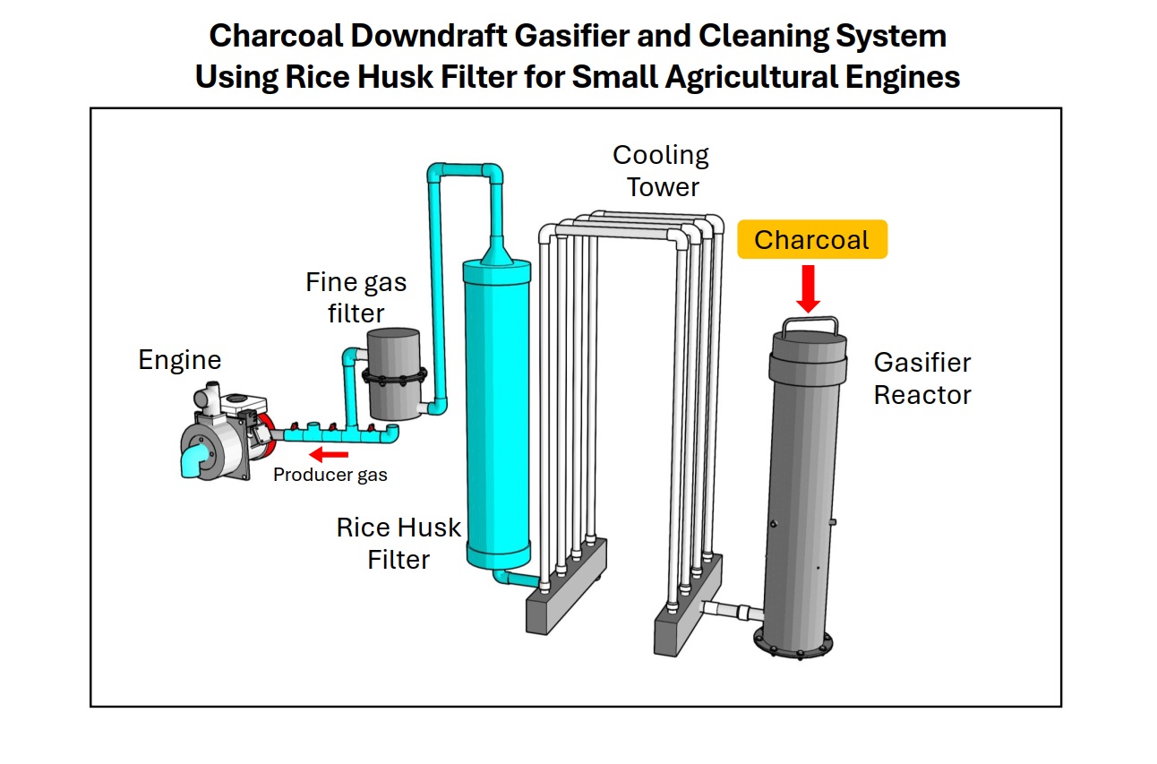 This invention presents a downdraft biomass gasifier system designed to produce clean producer gas for small agricultural engines. The system uses charcoal made from discarded disposable chopsticks as fuel and includes a multi-stage gas purification unit consisting of a cooling tower, rice husk filter, and fine filter. The purified gas provides stable combustion performance suitable for engine operation and supports the BCG sustainability model by converting waste materials into clean energy.