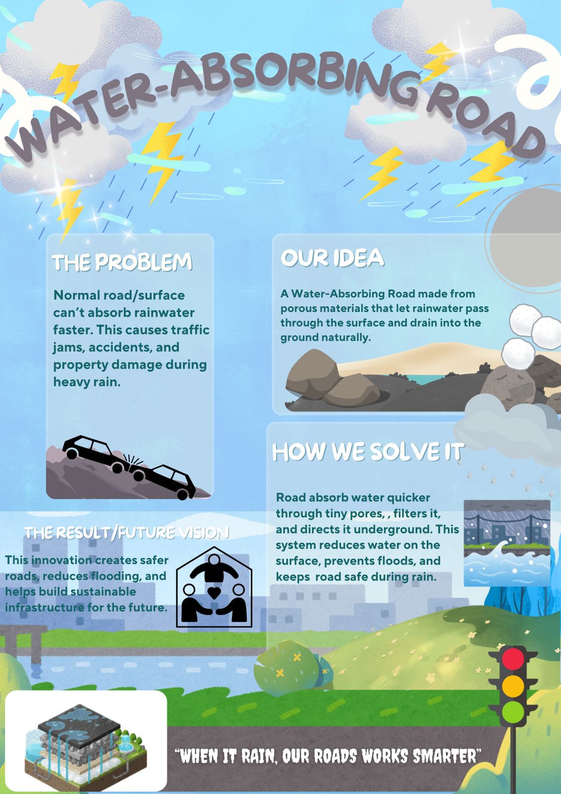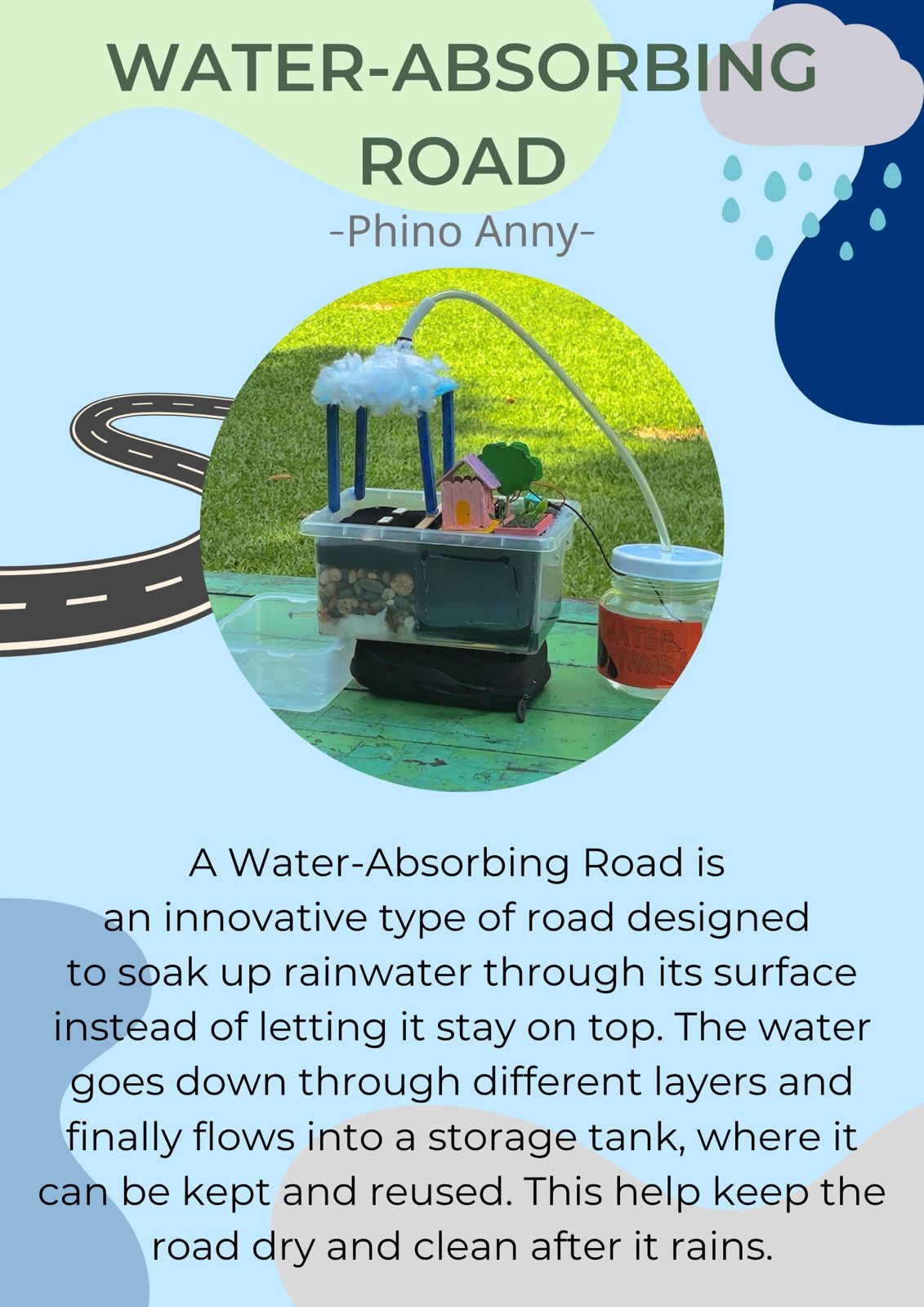 A Water Absorbing Road is an innovative type of road designed to soak up rainwater through it's surface instead of letting it stay on top. The water goes down through different layers and finally flows into a storage tank, where it can be kept and reused. This help keep the road dry and clean after it rains.