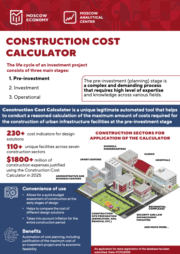 Construction Cost Calculator is a unique legitimate automated tool that helps to conduct a reasoned calculation of the maximum amount of costs required for the construction of urban infrastructure facilities at the pre-investment stage