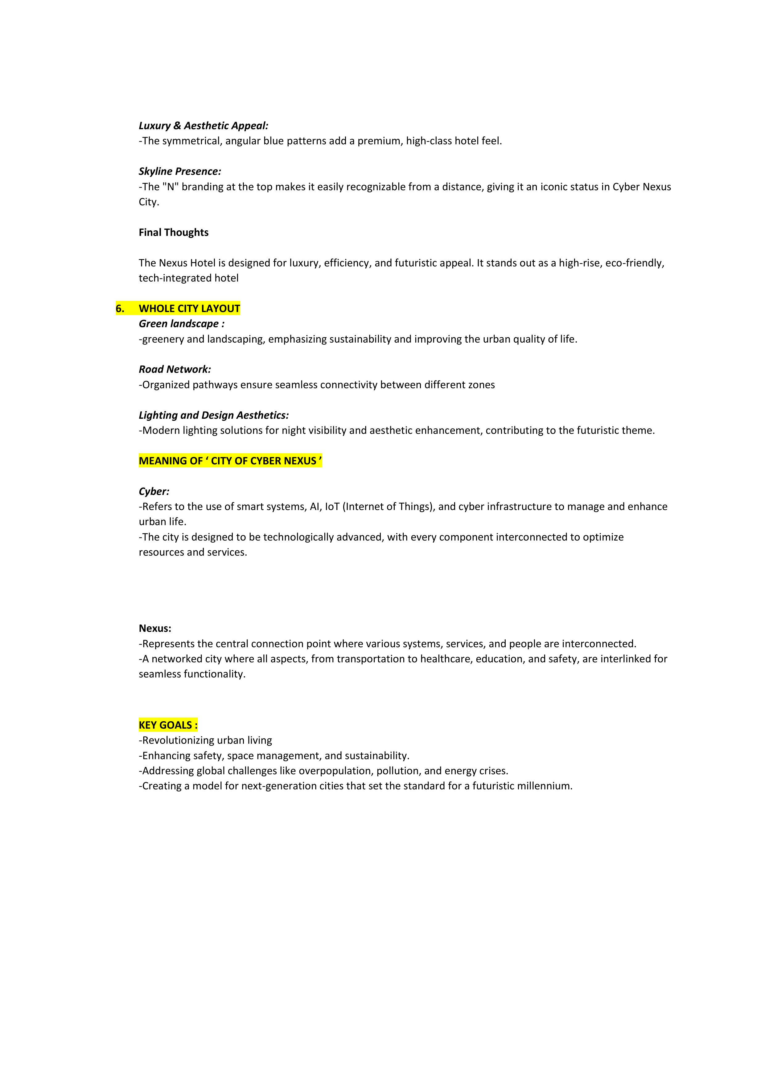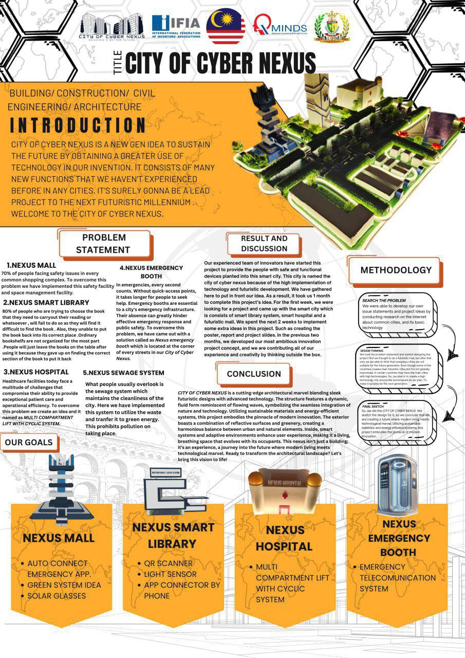 City of Cyber Nexus is a visionary smart city concept uniting technology, sustainability, and human-centered design. Built on five pillars—smart infrastructure, renewable energy, AI, cybersecurity, and green architecture—it transforms the way we live and connect. With IoT-based monitoring, AI-driven hospitals, smart malls, and waste-to-energy systems, it ensures safety, efficiency, and eco-balance. Designed for Industry 5.0, it symbolizes harmony between humans, nature and innovation