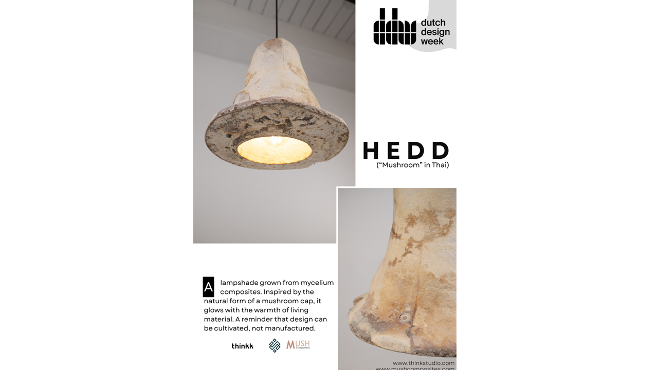 Mycelium-grown lampshade demonstrating controlled biofabrication of waste-based composites.