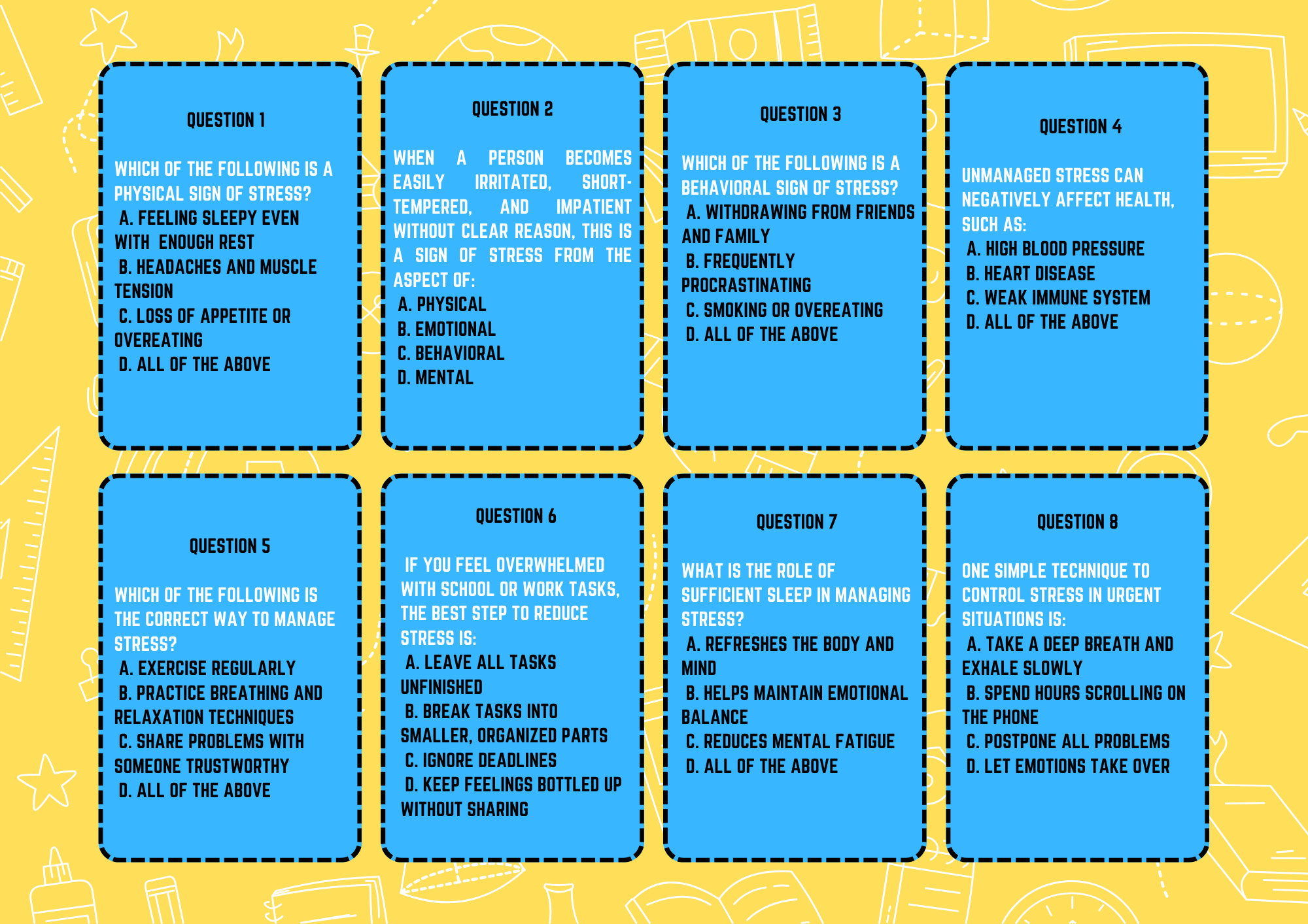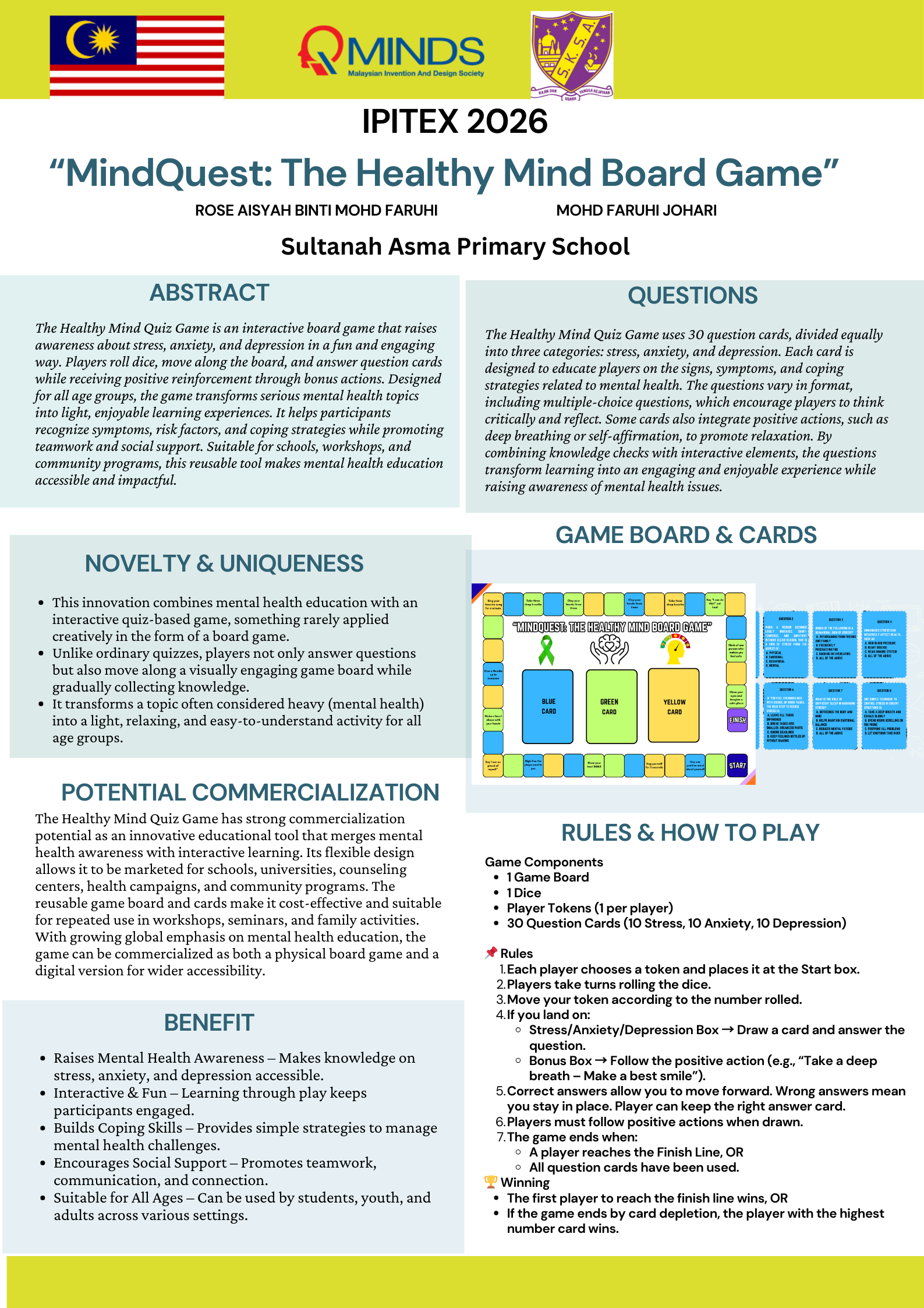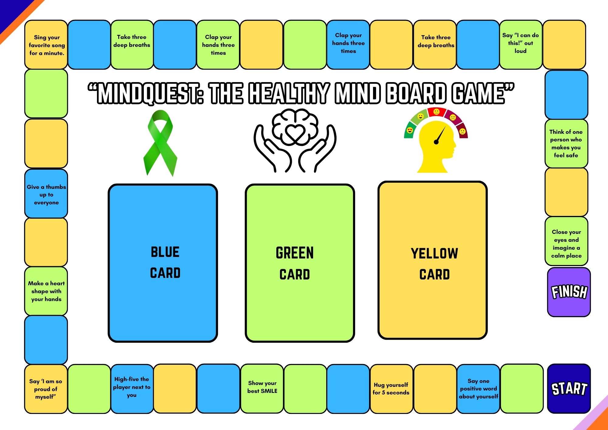 The Healthy Mind Quiz Game is an interactive board game that raises awareness about stress, anxiety, and depression in a fun and engaging way. Players roll dice, move along the board, and answer question cards while receiving positive reinforcement through bonus actions. Designed for all age groups, the game transforms serious mental health topics into light, enjoyable learning experiences. It helps participants recognize symptoms, risk factors, and coping strategies while promoting teamwork.