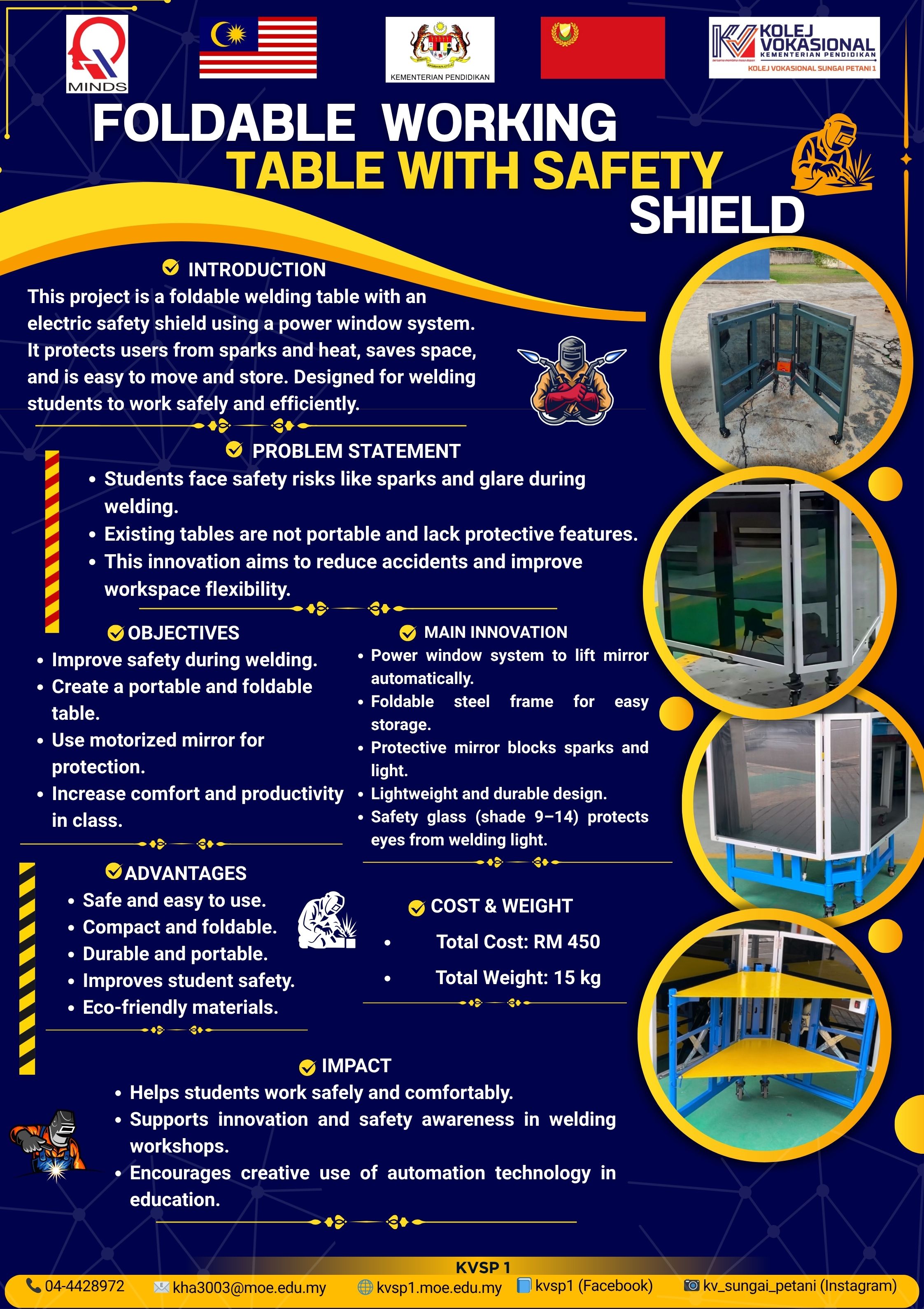 This project features a portable foldable welding table with an automatic acrylic shield powered by a modified car power-window system. Made of hollow steel and a steel plate surface, it enhances safety, mobility, and space efficiency. The shield can be raised or lowered automatically to protect users from sparks and arc radiation. Lockable wheels support easy movement, making it a practical, modern, and user-friendly workstation for welding training.
