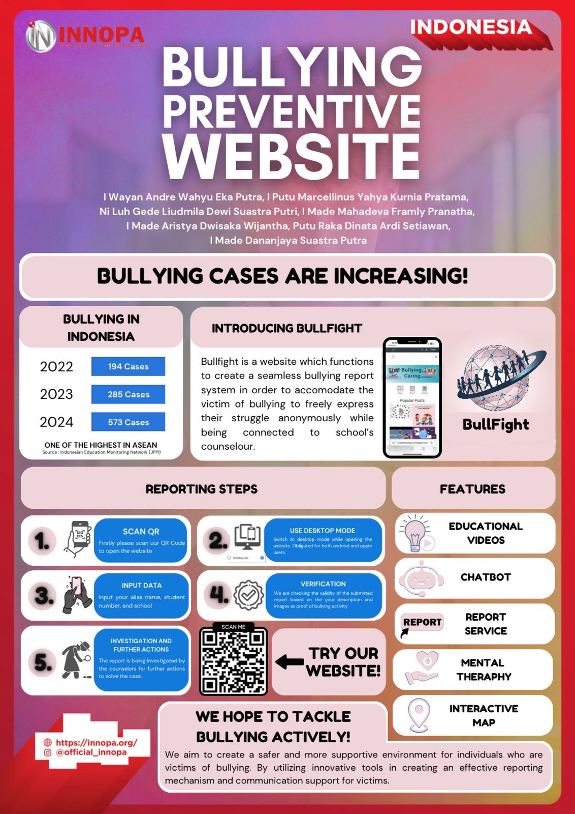The Stop Bullying Project aims to create a safe and supportive environment for bullying victims through innovative tools like Bullworth. This project features effective reporting mechanisms, communication support, and educational resources such as Chatbot, Google Maps, and videos. The focus of the project is to raise awareness, facilitate case reporting, and prevent bullying behavior. By promoting prevention and maintaining victim privacy, this project contributes to a more inclusive and empathe