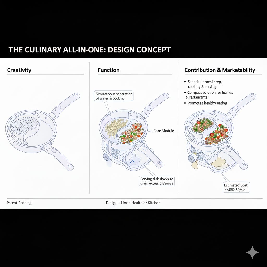 The Health Pan is an all-in-one device integrating a pan, prep tools, and serving dish. Its built-in drainage removes excess water and oil directly, enabling healthier, less greasy meals. This streamlines cooking, reduces cleanup, and lowers fat consumption. At ~USD 50, it's a cost-effective solution for health-conscious homes and restaurants.