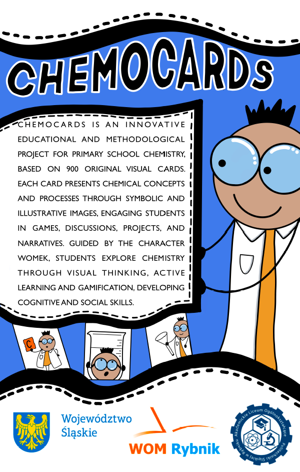 CHEMOCARDS is an innovative educational and methodological project for primary school chemistry, based on 900 original visual cards. Each card presents chemical concepts and processes through symbolic and illustrative images, engaging students in games, discussions, projects, and narratives. Guided by the character WOMEK, students explore chemistry through visual thinking, active learning, and gamification, developing cognitive and social skills.