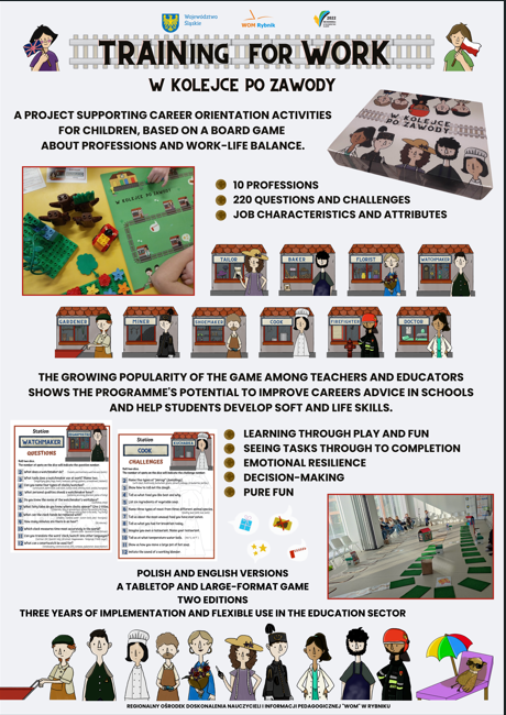 The board game “TRAINing for Work” was released in two editions: the first in 2022 in Polish, and the second in 2025 as a bilingual Polish-English version. The task and question cards were updated based on teachers’ feedback, reflecting linguistic differences and cultural nuances related to specific professions. This original educational project supports teachers in implementing career pre-orientation and guidance activities for children and youth.