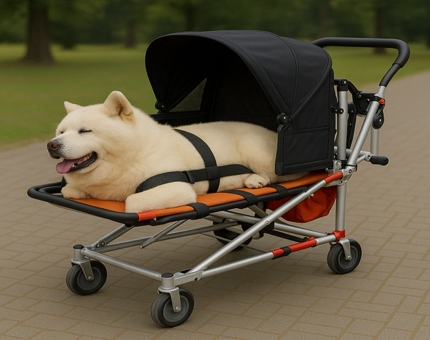 As pets age, the number of dogs and cats experience mobility issues or paralysis due to joint degeneration. Many female owners hesitate to care for medium- to large-sized elderly dogs because of limited physical strength. Currently, single-function assistive devices—such as wheelchairs or carts—are relatively simple but cannot provide both care and emergency transport. To address this, the multifunctional pet cart design combines four functions into one device: a cart, stretcher, transport frame