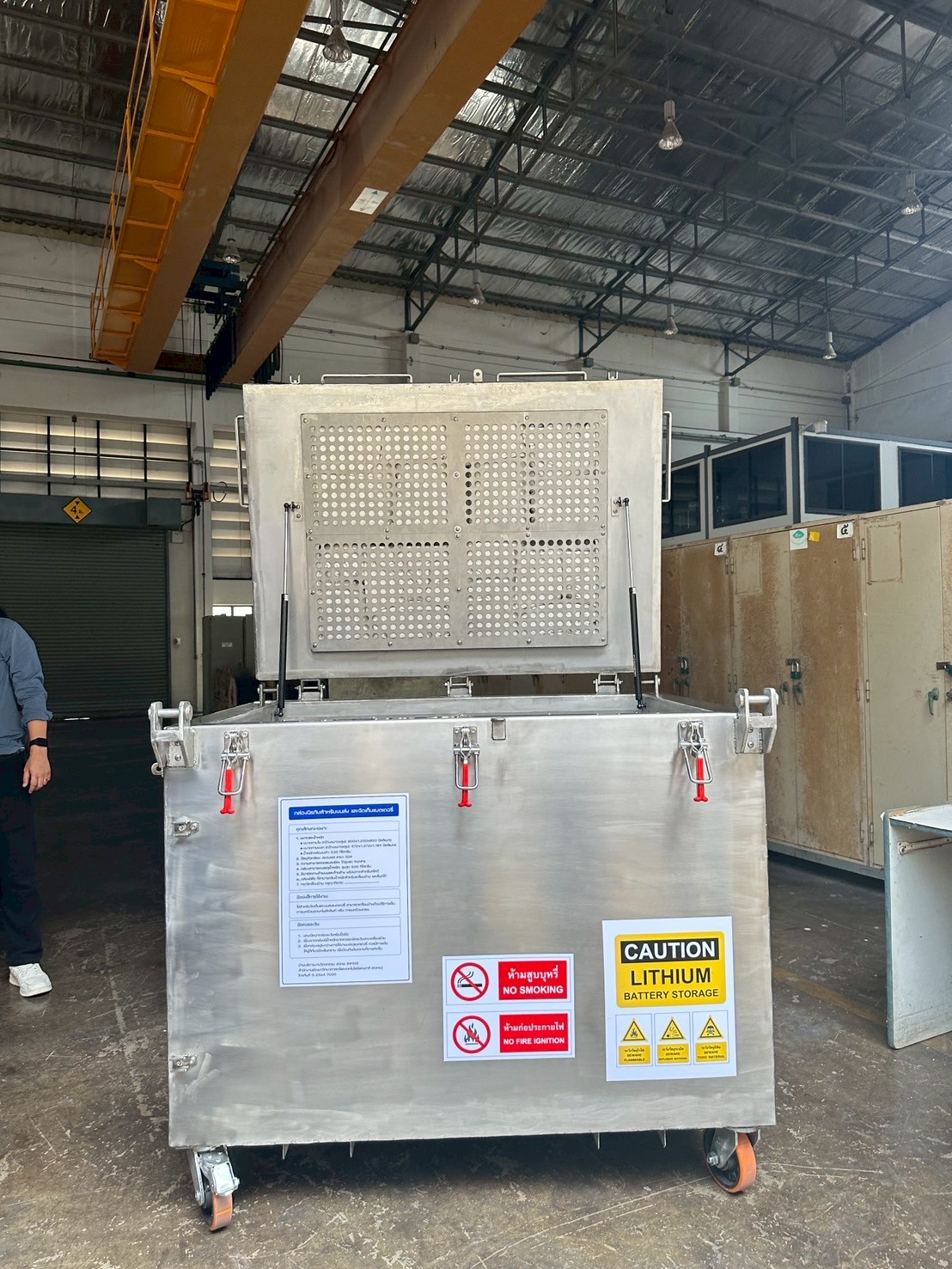 A fire- and explosion-resistant safety box engineered for transporting high-risk lithium batteries. Built from corrosion-proof metal and validated by FEM analysis, it complies with UN 38.3 and IEC 62133-2 standards. With 500 kg load capacity, 96 kPa pressure tolerance, and mobility for crane, forklift, or wheel handling.