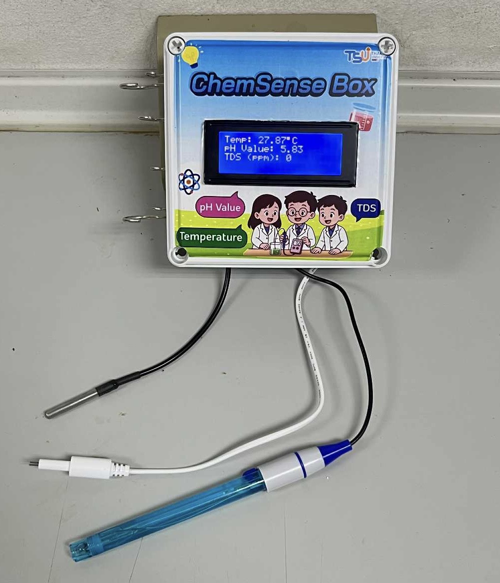 The ChemSense Box is a portable IoT enabled chemistry kit that provides real-time measurements of pH, electrical conductivity (TDS), and temperature. Its three sensor modules collect and display data instantly, supporting systematic analysis through linked learning resources. Designed for safe, hands-on inquiry without a laboratory, it enhances STEM skills and helps learners connect chemical principles to real-world contexts.