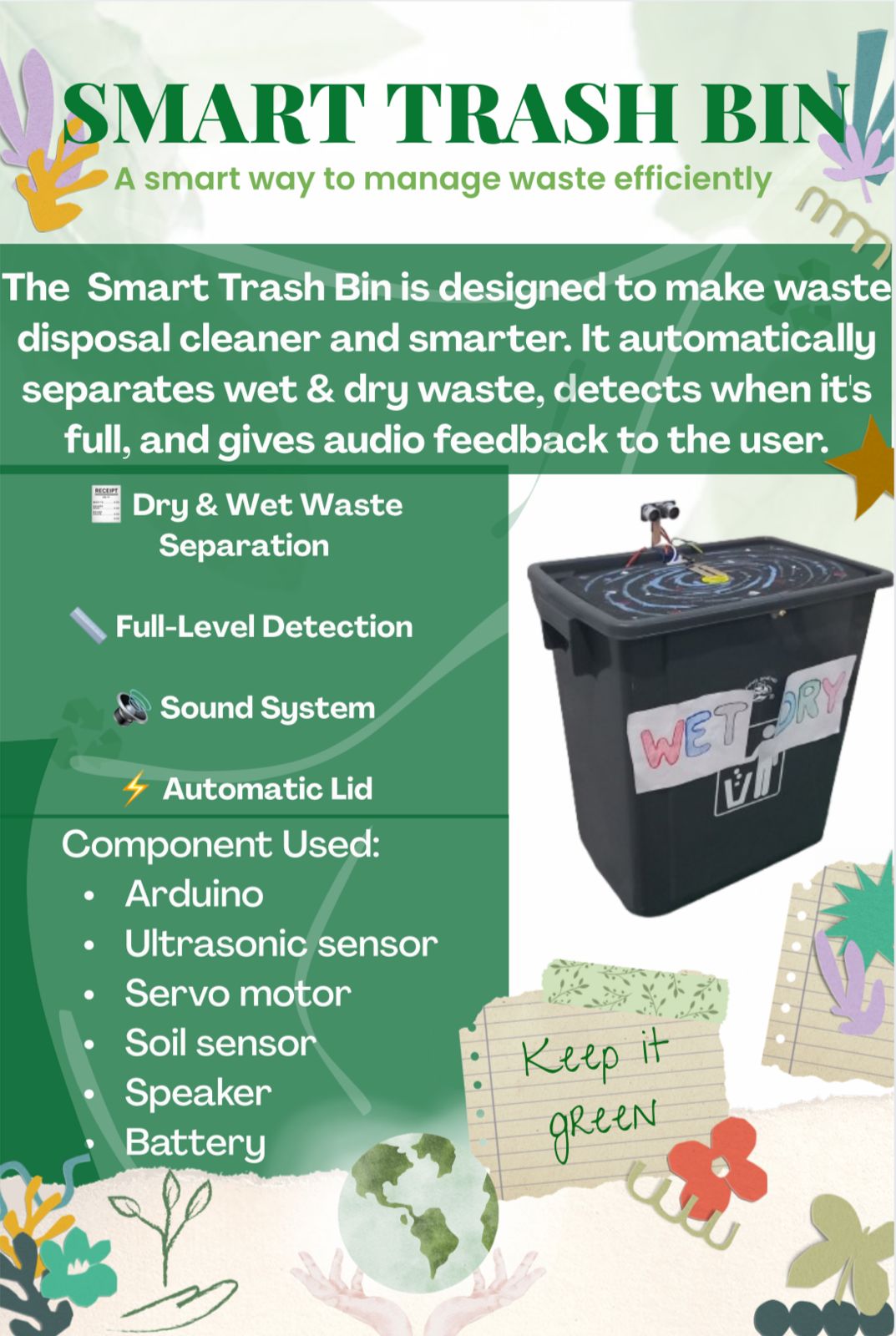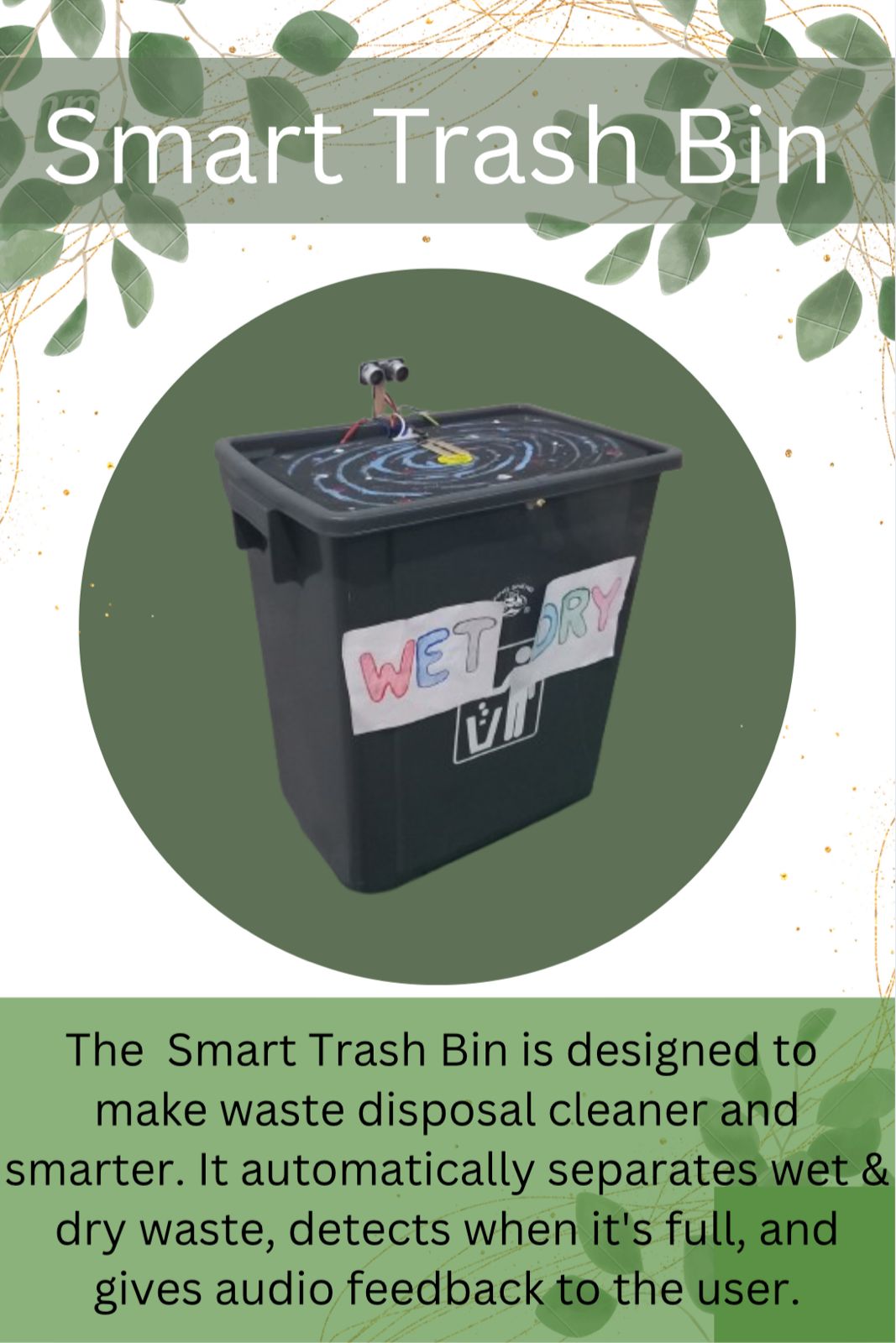 The smart trash bin is designed to make waste disposal cleaner and smarter. It automatically separates wet and dry waste detects when it's full and gives audio feedback to the user