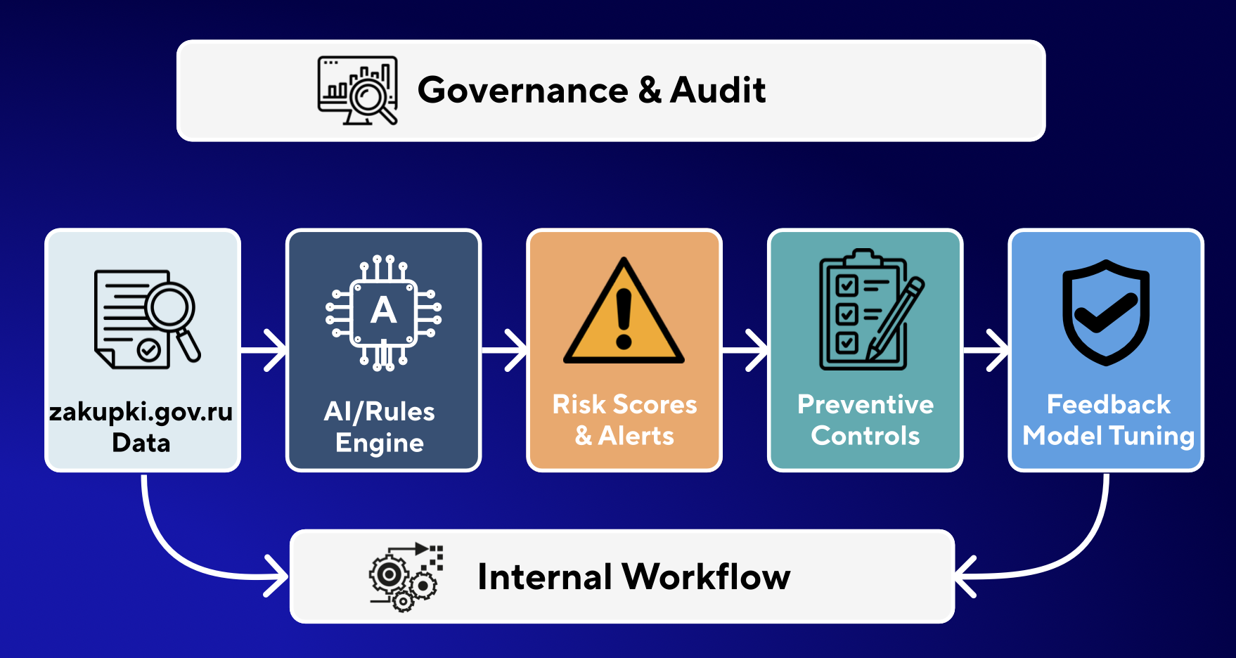 An integrated ecosystem that connects two parallel information systems: External Watcher: continuously ingests data from the official public procurement portal (zakupki.gov.ru), analyzes notices, contracts and execution data, and flags potential legal non-compliance. Internal Process Automation: a workflow platform that manages planning → tendering & contracting → execution → claims & legal actions → acceptance & payment.