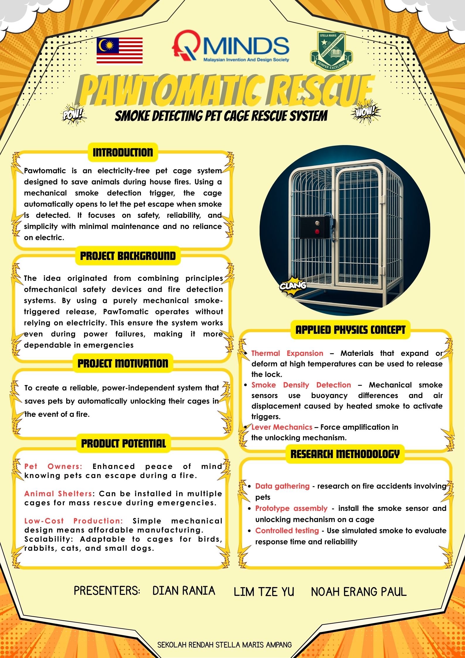 PawTomatic Rescue is an innovative invention designed to save pets during house fires. Its novelty lies in being an automatic rescue system specially created for animals. The device works by detecting smoke and automatically opening the pet’s cage, allowing them to escape safely. Its benefits include protecting pets’ lives, reducing fire-related risks, and giving owners peace of mind.