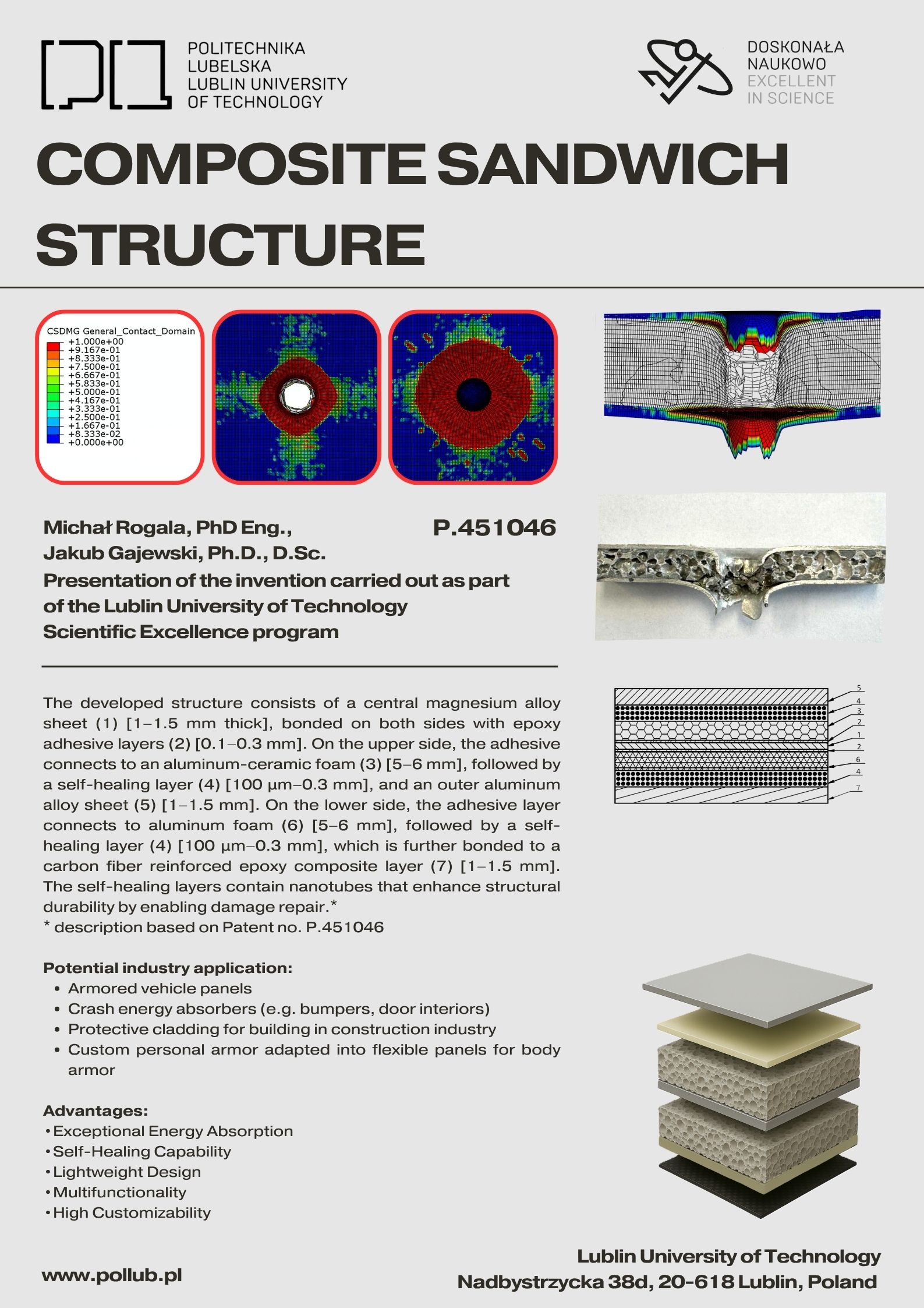 The invention is a multi-layer composite sandwich structure based on aluminum/aluminum-ceramic foams with a magnesium alloy core, aluminum sheet and carbon-epoxy skins and epoxy-based self-healing layers containing microcapsules, providing lightweight, high-strength, and damage-repairing capabilities.